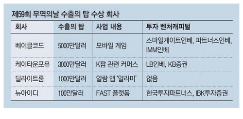 出口量最大的公司是提供各种移动游戏服务的“贝尔代码”(Beaglenode)。他们获得了“5000万美元出口之巅”奖,且出口额持续增加,2020年为2000万美元,2021年为3000万美元。贝尔代码去年实现了810亿韩元的销售额,今年上半年成功实现了盈利。此外,贝尔代码还被认可为“服务之巅”。在创业公司中,出口量第二大的是K-pop商务平台“Ktown4u”。Ktown4u向全球240多个国家出口K-pop相关专辑和商品,其出口规模持续扩大。今年4月,Ktown4u吸引了50亿韩元的投资,主要投资者包括LB Investment和KB Securities。