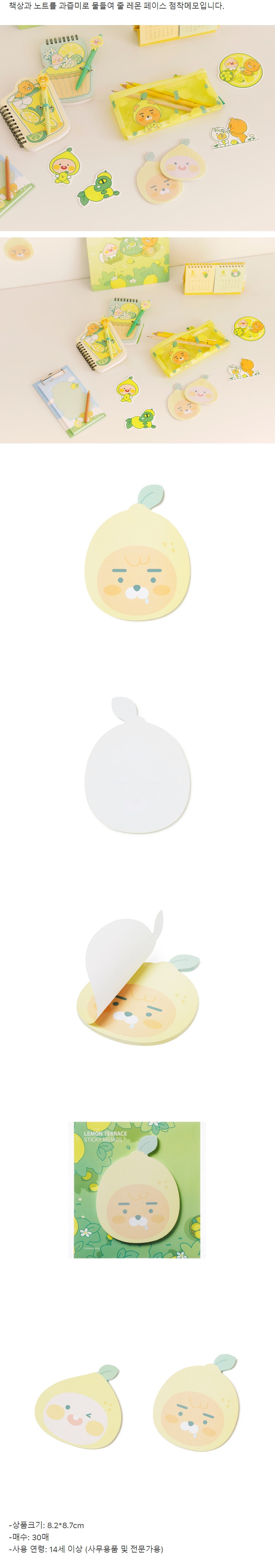 详细情报运营方针客户评论NOTICE* 商品外盒是为保护商品防止冲击而制作的,在包装/运输过程中可能会产生划痕及褶皱、变色等现象,该现象不能作为商品的退换理由。[KAKAO FRIENDS] Lemon Terrace Sticky Memos (Ryan) Details Size : 8*10.2cm 30 notes Age of use: At least 14 years old IMFORMATION * The outer case is just for protecting goods. (scratches and discoloration on the case can not be the reason for exchanging or returning) 商品情报提供告示商品名 : [KAKAO FRIENDS] 清新柠檬便利贴 - Ryan原产地 : Korea制造/进口 : KAKAO FRIENDS KAKAO FRIENDS质量保证标准 : 依照相关法律及消费者纠纷解决规定AS中心热线 : Ktown4u, 02-552-0978