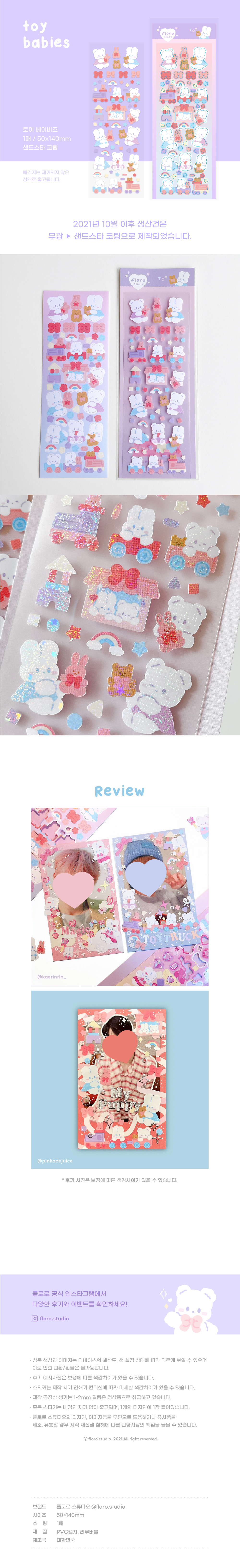 详细情报运营方针客户评论NOTICE* 商品外盒是为保护商品防止冲击而制作的,在包装/运输过程中可能会产生划痕及褶皱、变色等现象,该现象不能作为商品的退换理由。floro studio Toy Sticker PART ・根据设备的分辨率,颜色设定的不同,商品颜色和图片看起来可能略有差异,这点无法成为交换/退款的理由。 ・后期示例照片因为修图颜色可能会有差异 ・贴纸根据制作时印刷机的状态会有细微的色感差异 ・制作工序中产生的细微划痕/挤压/喷墨等均视为正常 ・所有贴纸均不去除背景纸出库,每个设计里含有1张背景纸 INFORMATION 商品情报提供告示商品名 : floro Toy Sticker原产地 : Korea制造/进口 : 플로로 스튜디오 플로로 스튜디오质量保证标准 : 依照相关法律及消费者纠纷解决规定AS中心热线 : Ktown4u, 02-552-0978