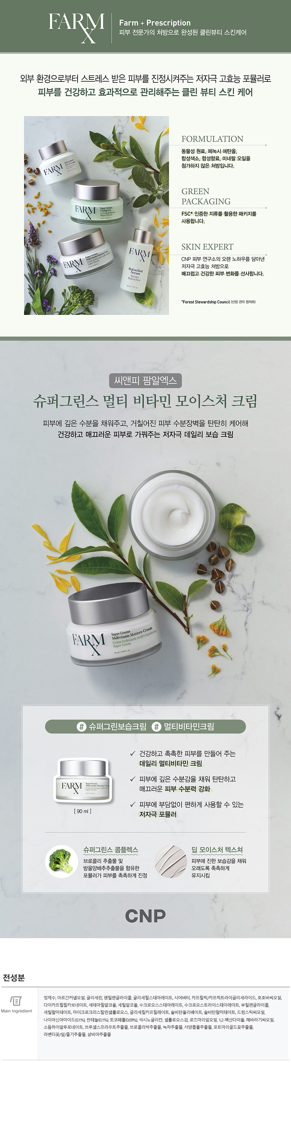 详细情报运营方针客户评论NOTICE* 商品外盒是为保护商品防止冲击而制作的,在包装/运输过程中可能会产生划痕及褶皱、变色等现象,该现象不能作为商品的退换理由。 [CNP] FARM RX SUPER GREENS MULTIVITAMIN CREAM PART * The outer case is just for protecting goods. (scratches and discoloration on the case can not be the reason for exchanging or returning) INFORMATION 商品情报提供告示商品名 : 【希恩派】综合维他命超强保湿面霜 90ml原产地 : Korea制造/进口 : (주)엘지생활건강 (주)엘지생활건강质量保证标准 : 依照相关法律及消费者纠纷解决规定AS中心热线 : Ktown4u, 02-552-0978