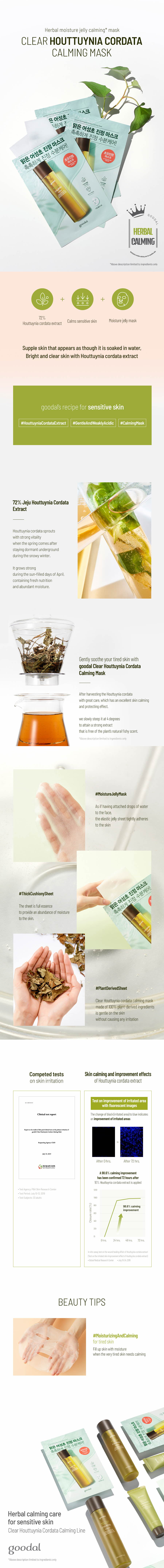详细情报运营方针客户评论NOTICE* 商品外盒是为保护商品防止冲击而制作的,在包装/运输过程中可能会产生划痕及褶皱、变色等现象,该现象不能作为商品的退换理由。 [Goodal] Houttuynia Cordata Calming Mask PART * The outer case is just for protecting goods. (scratches and discoloration on the case can not be the reason for exchanging or returning) INFORMATION 商品情报提供告示商品名 : 【果达儿】鱼腥草镇静面膜 *5片原产地 : Korea制造/进口 : (주)클리오 (주)클리오质量保证标准 : 依照相关法律及消费者纠纷解决规定AS中心热线 : Ktown4u, 02-552-0978