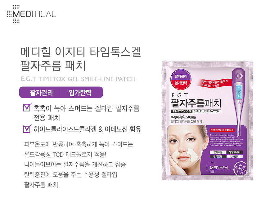 详细情报运营方针客户评论NOTICE* 商品外盒是为保护商品防止冲击而制作的,在包装/运输过程中可能会产生划痕及褶皱、变色等现象,该现象不能作为商品的退换理由。 [MEDIHEAL] E.G.T TIMETOX GEL SMILE-LINE PATCH (5POUCH) PART * The outer case is just for protecting goods. (scratches and discoloration on the case can not be the reason for exchanging or returning) INFORMATION 商品情报提供告示商品名 : 【美迪惠尔】 E.G.T 法令纹淡化贴 *5片原产地 : Korea制造/进口 : (주)이시스코스메틱 엘앤피코스메틱(주)质量保证标准 : 依照相关法律及消费者纠纷解决规定AS中心热线 : Ktown4u, 02-552-0978