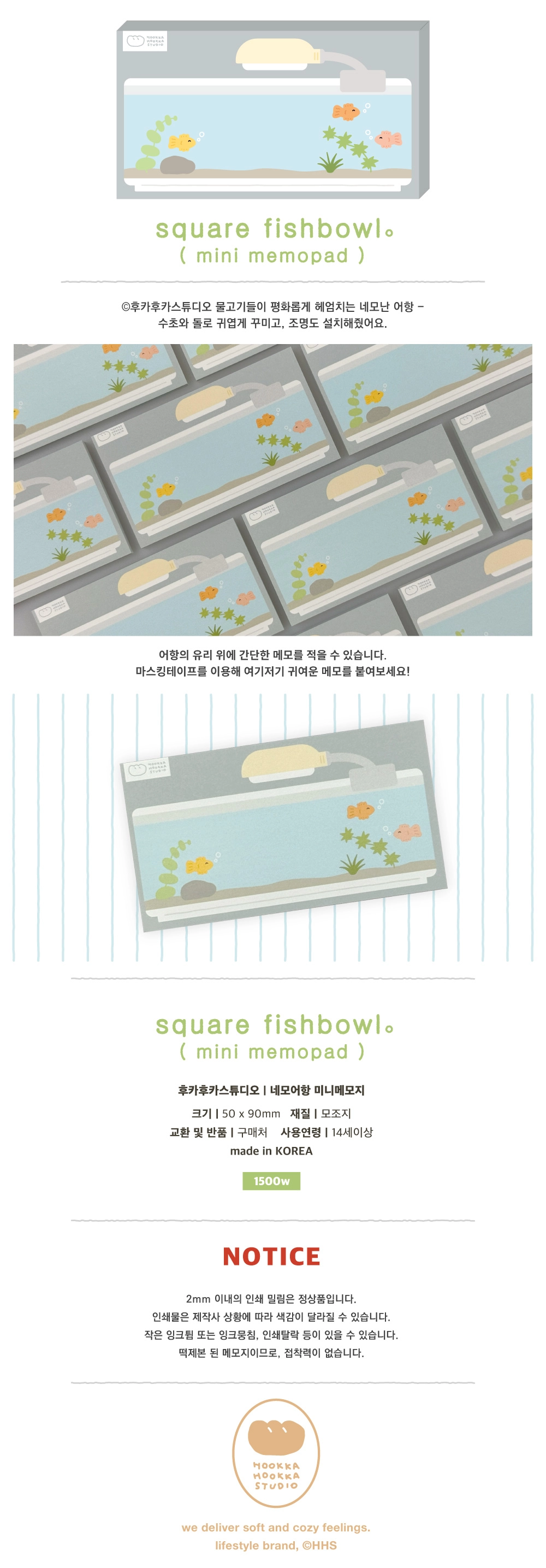 详细情报运营方针客户评论NOTICE* 商品外盒是为保护商品防止冲击而制作的,在包装/运输过程中可能会产生划痕及褶皱、变色等现象,该现象不能作为商品的退换理由。[HOOKKA HOOKKA STUDIO] Square Fish Tank Mini Memo PART INFORMATION 商品情报提供告示商品名 : [HOOKKA HOOKKA STUDIO] 方形鱼缸迷你便签本原产地 : Korea制造/进口 : 주식회사 유오코 质量保证标准 : 依照相关法律及消费者纠纷解决规定AS中心热线 : Ktown4u, 02-552-0978