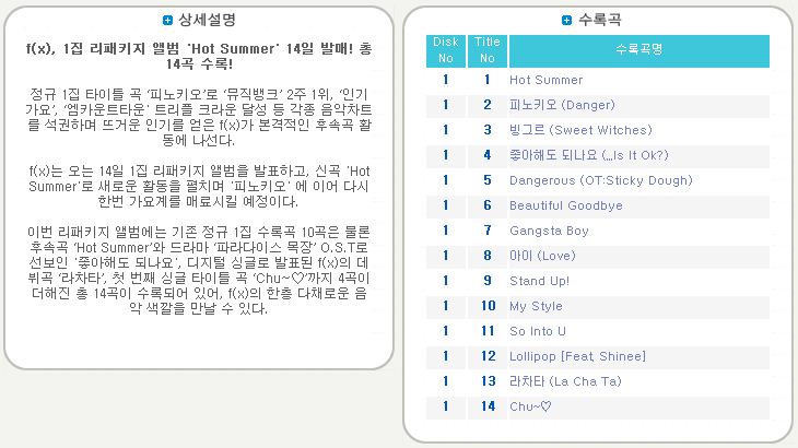 详细情报运营方针客户评论NOTICE* 商品外盒是为保护商品防止冲击而制作的,在包装/运输过程中可能会产生划痕及褶皱、变色等现象,该现象不能作为商品的退换理由。商品情报提供告示商品名 : f(x) - 1辑后续 [Hot Summer] 原产地 : Korea制造/进口 : (주)드림어스컴퍼니 质量保证标准 : 依照相关法律及消费者纠纷解决规定AS中心热线 : Ktown4u, 02-552-0978