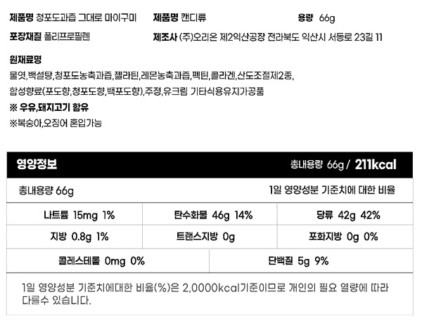详细情报运营方针客户评论NOTICE* 商品外盒是为保护商品防止冲击而制作的,在包装/运输过程中可能会产生划痕及褶皱、变色等现象,该现象不能作为商品的退换理由。[ORION]Mygummy Green grape 66gPARTINFORMATION 商品情报提供告示商品名 : [ORION] - 绿葡萄软糖 66克原产地 : Korea制造/进口 : 오리온 质量保证标准 : 依照相关法律及消费者纠纷解决规定AS中心热线 : Ktown4u, 02-552-0978