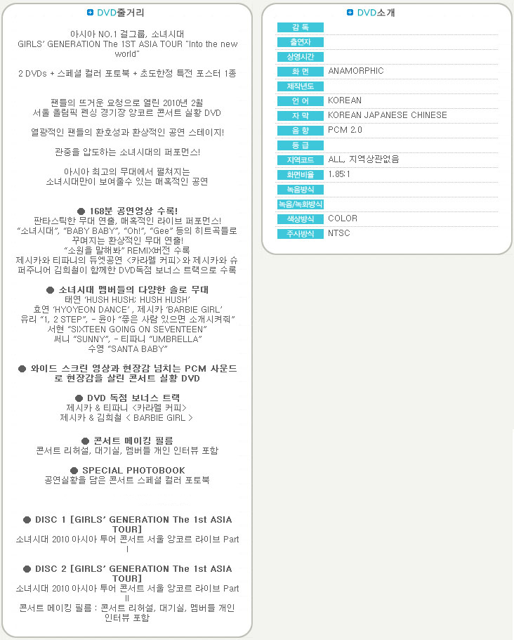详细情报运营方针客户评论NOTICE* 商品外盒是为保护商品防止冲击而制作的,在包装/运输过程中可能会产生划痕及褶皱、变色等现象,该现象不能作为商品的退换理由。-Region Code : All -Runnig Time : 218 Min (D1: 89, D2: 129) -Subtitle : Korean, Japanese, Chinese -1.85:1 Wide Screen -Audio : PCM 2.0 / Dolby Digital Stereo 5.1 -Region Code : All -Runnig Time : 218 Min (D1: 89, D2: 129) -Subtitle : Korean, Japanese, Chinese -1.85:1 Wide Screen -Audio : PCM 2.0 / Dolby Digital Stereo 5.1 商品情报提供告示商品名 : [DVD] Girls` Generation : The 1st Asia Tour [Into The New World] (2disc)原产地 : Korea制造/进口 : 에스비이에스 콘텐츠허브 质量保证标准 : 依照相关法律及消费者纠纷解决规定AS中心热线 : Ktown4u, 02-552-0978