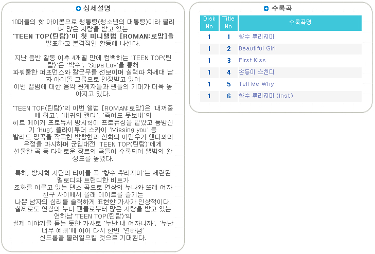 详细情报运营方针客户评论NOTICE* 商品外盒是为保护商品防止冲击而制作的,在包装/运输过程中可能会产生划痕及褶皱、变色等现象,该现象不能作为商品的退换理由。商品情报提供告示商品名 : TEEN TOP - 迷你一辑 [Roman] (+44p 写真册)原产地 : Korea制造/进口 : (주)로엔엔터테인먼트 质量保证标准 : 依照相关法律及消费者纠纷解决规定AS中心热线 : Ktown4u, 02-552-0978