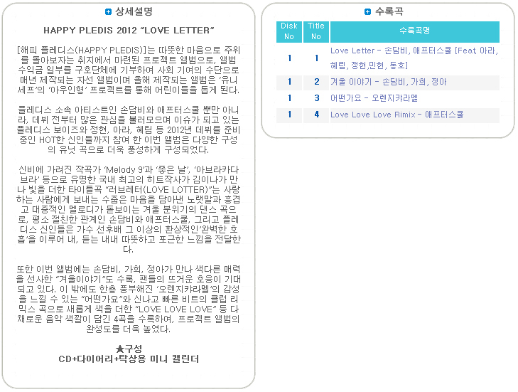 详细情报运营方针客户评论NOTICE* 商品外盒是为保护商品防止冲击而制作的,在包装/运输过程中可能会产生划痕及褶皱、变色等现象,该现象不能作为商品的退换理由。商品情报提供告示商品名 : Son Dam Bi & After School - Happy Pledis 2012 Love Letter (+Diary + Mini Calendar)原产地 : Korea制造/进口 : 质量保证标准 : 依照相关法律及消费者纠纷解决规定AS中心热线 : Ktown4u, 02-552-0978