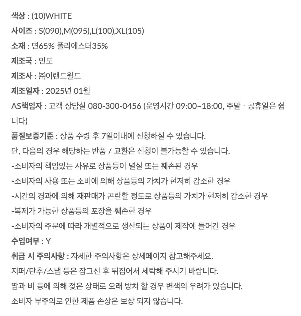 • 制造/进口 : (주)이랜드월드패션사업부