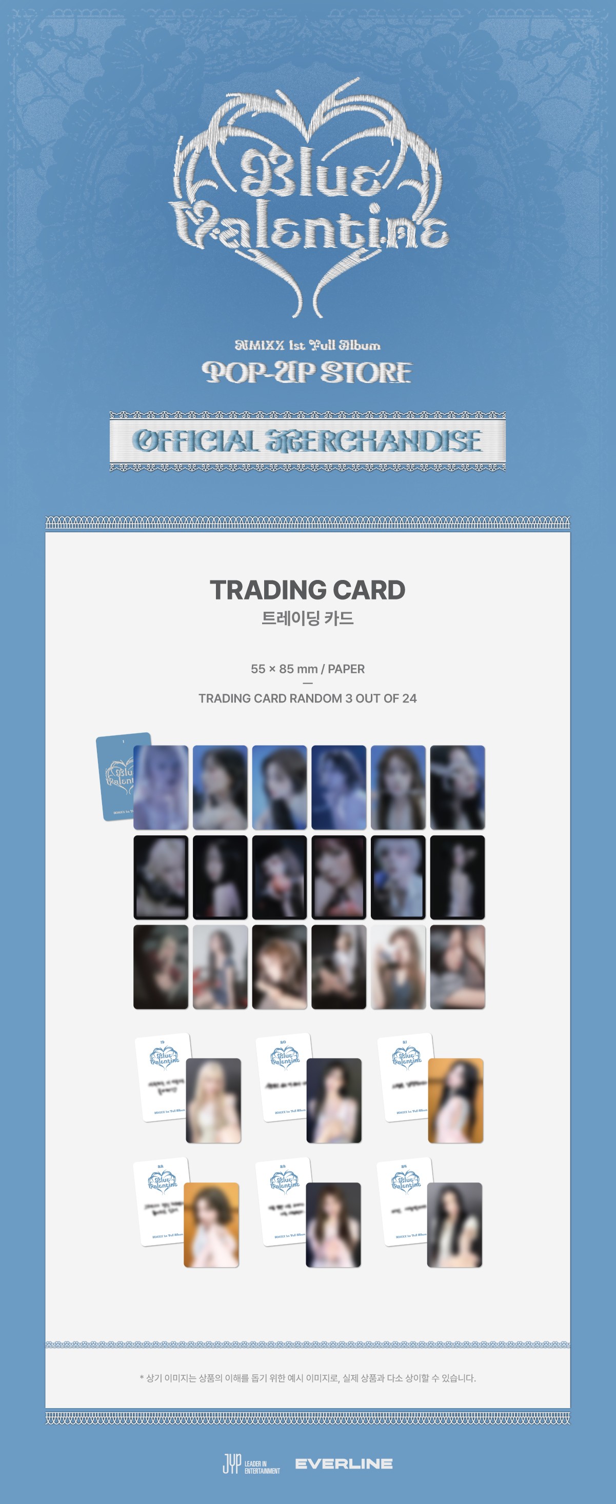 详细情报运营方针客户评论NOTICE* 商品外盒是为保护商品防止冲击而制作的,在包装/运输过程中可能会产生划痕及褶皱、变色等现象,该现象不能作为商品的退换理由。NMIXX[[Blue Valentine: inside the heart] MD] TRADING CARD PART INFORMATION 商品情报提供告示商品名 : NMIXX - [[Blue Valentine: inside the heart] MD] TRADING CARD原产地 : Korea制造/进口 : 质量保证标准 : 依照相关法律及消费者纠纷解决规定AS中心热线 : Ktown4u, 02-552-0978