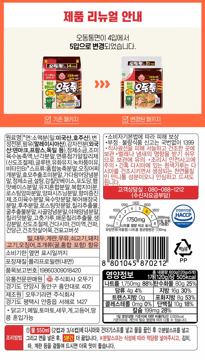 详细情报运营方针客户评论NOTICE* 商品外盒是为保护商品防止冲击而制作的,在包装/运输过程中可能会产生划痕及褶皱、变色等现象,该现象不能作为商品的退换理由。[OTTOGI] Odongtong Ramen 120g *5EA PART INFORMATION 商品情报提供告示商品名 : [OTTOGI] Odongtong Ramen 120g *5EA原产地 : Korea制造/进口 : 오뚜기 质量保证标准 : 依照相关法律及消费者纠纷解决规定AS中心热线 : Ktown4u, 02-552-0978