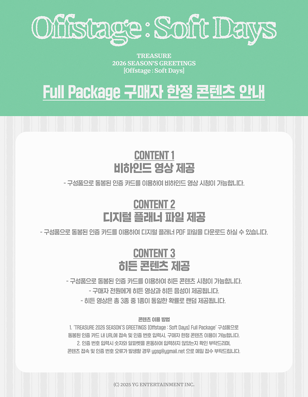1. 通过“TREASURE 2026 SEASON’S GREETINGS [Offstage : Soft Days] Full Package”商品所附的认证卡,访问卡内提供的URL并输入认证编号后,即可使用购买者限定内容。