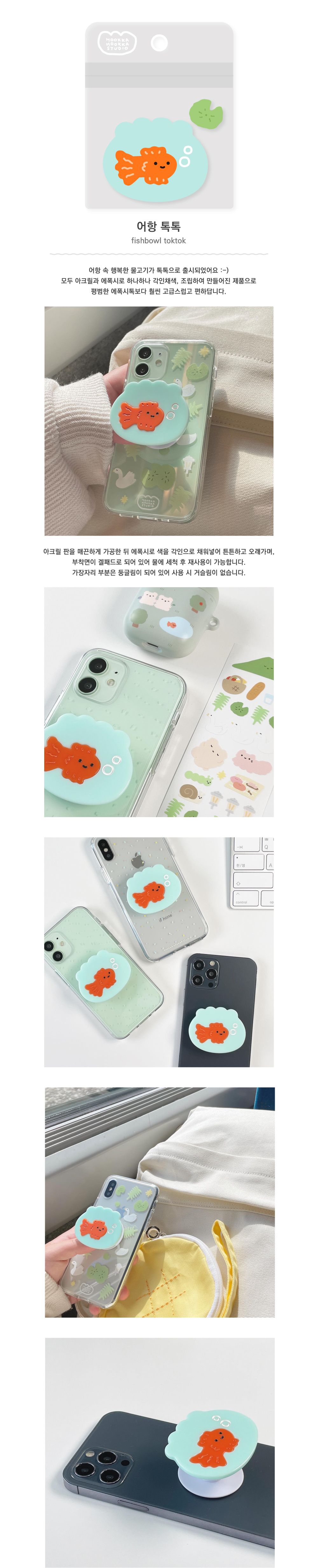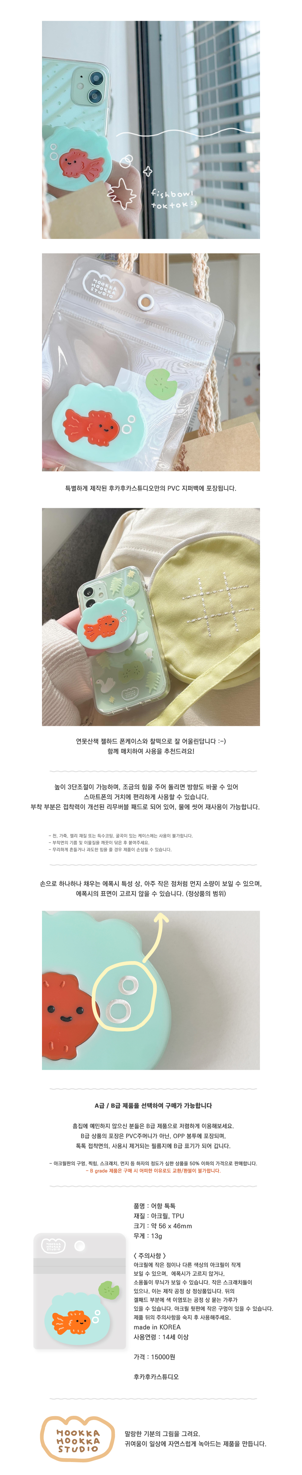 详细情报运营方针客户评论NOTICE* 商品外盒是为保护商品防止冲击而制作的,在包装/运输过程中可能会产生划痕及褶皱、变色等现象,该现象不能作为商品的退换理由。[HOOKKA HOOKKA STUDIO] Fish Tank TokTok Grip PART INFORMATION 商品情报提供告示商品名 : [HOOKKA HOOKKA STUDIO] 鱼缸 手机支架原产地 : Korea制造/进口 : 주식회사 유오코 质量保证标准 : 依照相关法律及消费者纠纷解决规定AS中心热线 : Ktown4u, 02-552-0978