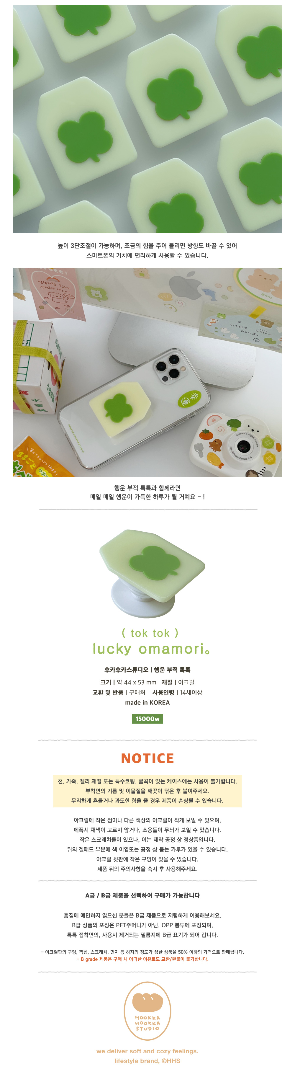 详细情报运营方针客户评论NOTICE* 商品外盒是为保护商品防止冲击而制作的,在包装/运输过程中可能会产生划痕及褶皱、变色等现象,该现象不能作为商品的退换理由。[HOOKKA HOOKKA STUDIO] Lucky Charm TokTok Grip PART INFORMATION 商品情报提供告示商品名 : [HOOKKA HOOKKA STUDIO] 幸运护符 手机支架原产地 : Korea制造/进口 : 주식회사 유오코 质量保证标准 : 依照相关法律及消费者纠纷解决规定AS中心热线 : Ktown4u, 02-552-0978