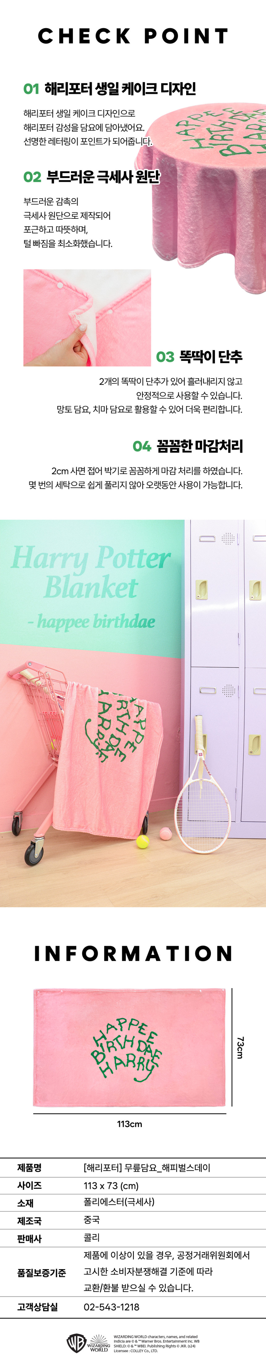 详细情报运营方针客户评论NOTICE* 商品外盒是为保护商品防止冲击而制作的,在包装/运输过程中可能会产生划痕及褶皱、变色等现象,该现象不能作为商品的退换理由。[Harry Potter] Microfiber Blanket_Birthday PART INFORMATION 商品情报提供告示商品名 : [Harry Potter] 超细纤维毯_生日原产地 : China制造/进口 : 주식회사 콜리 质量保证标准 : 依照相关法律及消费者纠纷解决规定AS中心热线 : Ktown4u, 02-552-0978