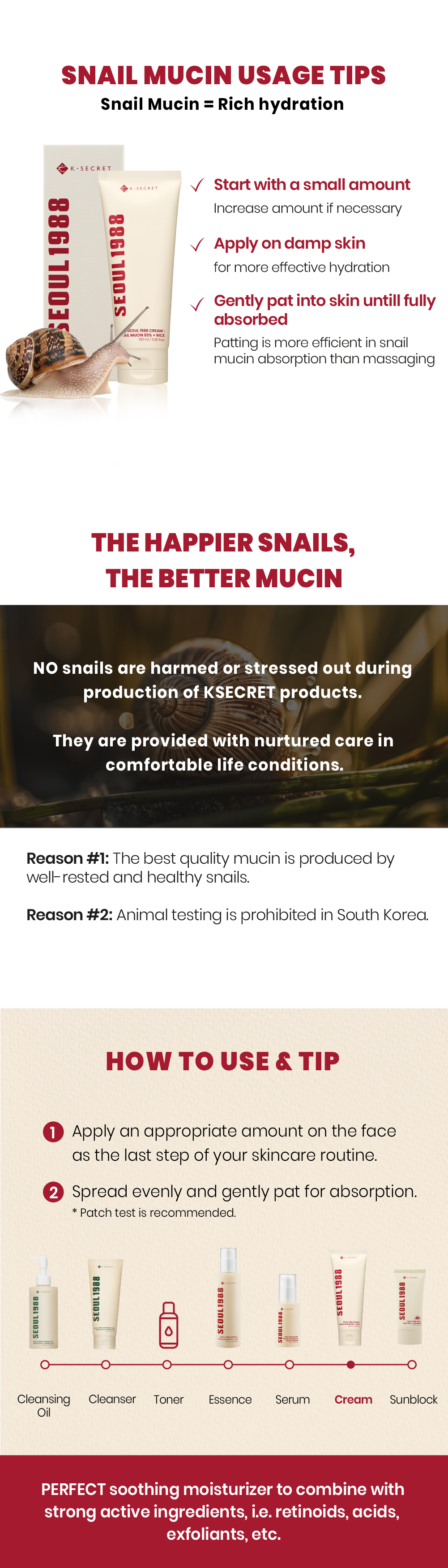 详细情报运营方针客户评论NOTICE* 商品外盒是为保护商品防止冲击而制作的,在包装/运输过程中可能会产生划痕及褶皱、变色等现象,该现象不能作为商品的退换理由。[K-SECRET] SEOUL 1988 Cream 100ml : Snail Mucin 93% + RicePART INFORMATION 商品情报提供告示商品名 : [K-SECRET] SEOUL 1988 Cream 100ml : Snail Mucin 93% + Rice原产地 : Korea制造/进口 : 주식회사 케이시크릿 质量保证标准 : 依照相关法律及消费者纠纷解决规定AS中心热线 : Ktown4u, 02-552-0978