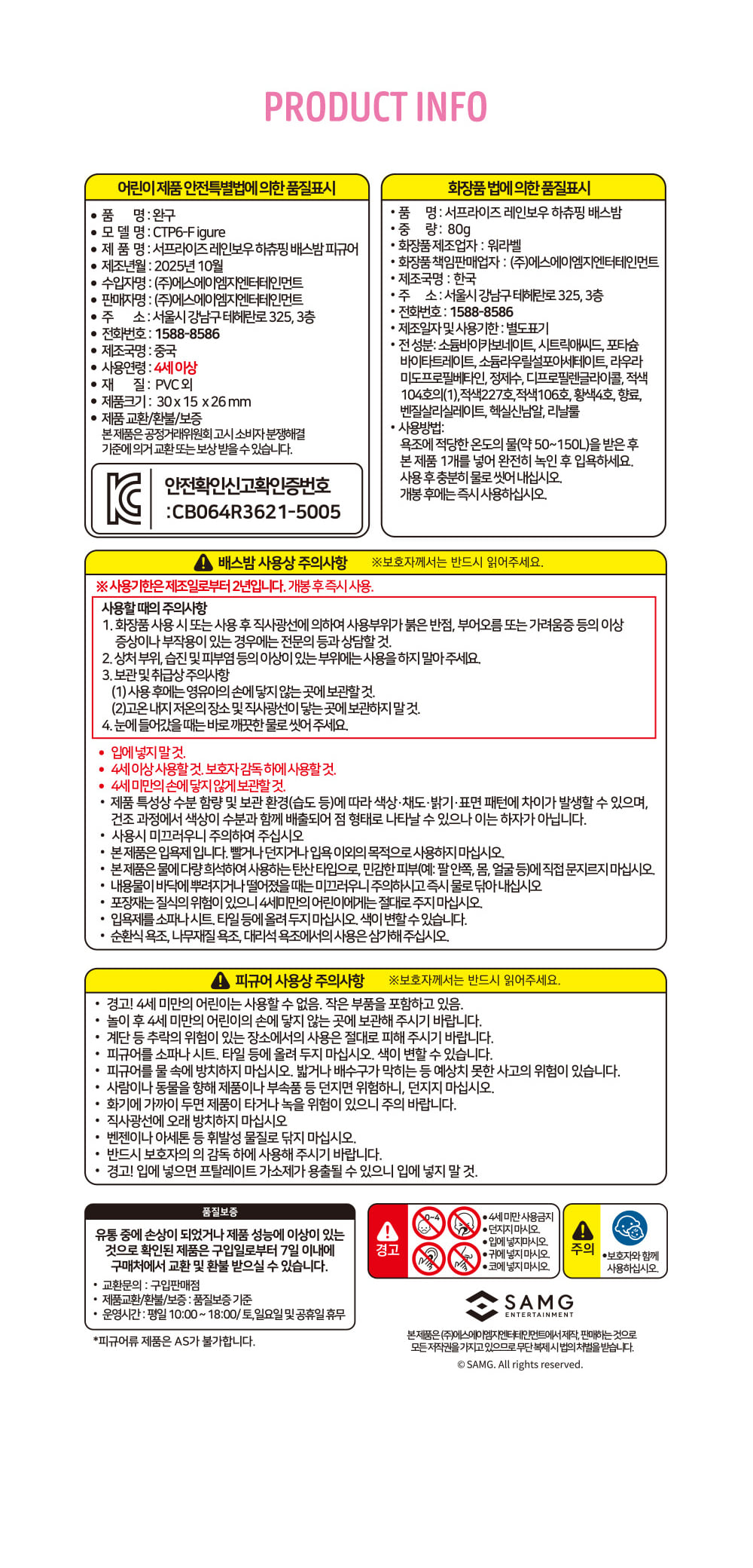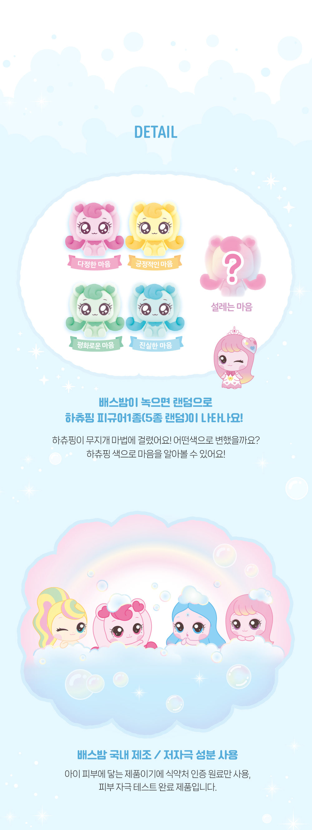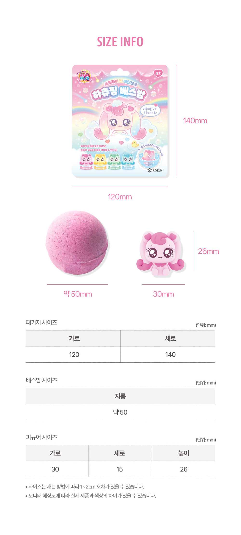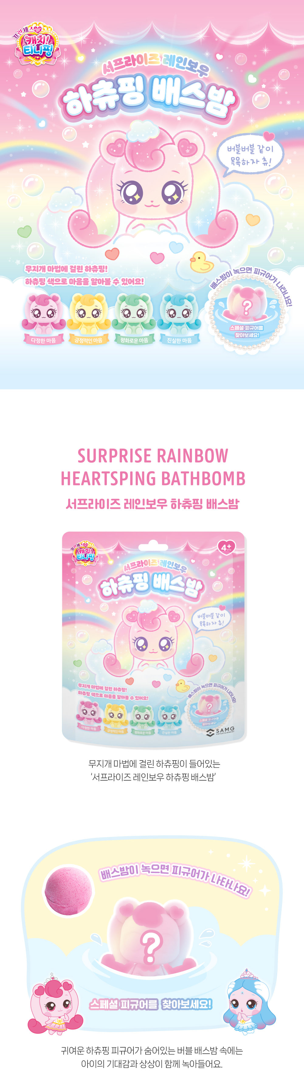详细情报运营方针客户评论NOTICE* 商品外盒是为保护商品防止冲击而制作的,在包装/运输过程中可能会产生划痕及褶皱、变色等现象,该现象不能作为商品的退换理由。[Teenieping] Surprise Rainbow Hachuping Bath Bomb PART INFORMATION 商品情报提供告示商品名 : [迷你精灵] 惊喜彩虹 哈츄精灵 泡澡球原产地 : China制造/进口 : ㈜에스에이엠지엔터테인먼트 质量保证标准 : 依照相关法律及消费者纠纷解决规定AS中心热线 : Ktown4u, 02-552-0978