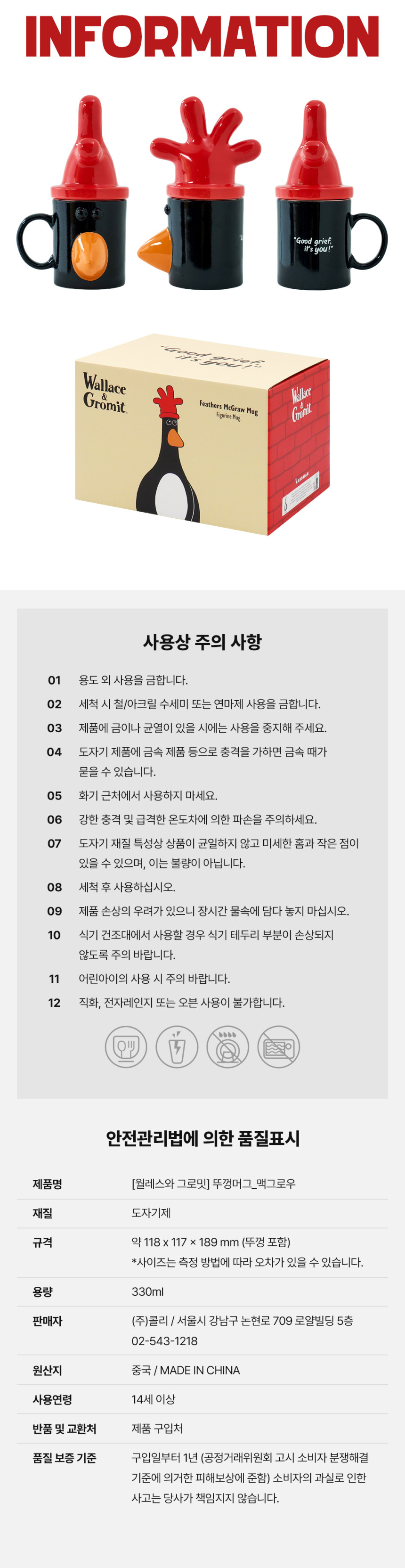 详细情报运营方针客户评论NOTICE* 商品外盒是为保护商品防止冲击而制作的,在包装/运输过程中可能会产生划痕及褶皱、变色等现象,该现象不能作为商品的退换理由。[Wallace & Gromit] Mug_McGraw PART INFORMATION 商品情报提供告示商品名 : [超级无敌掌门狗] 马克杯_McGraw原产地 : China制造/进口 : 주식회사 콜리 质量保证标准 : 依照相关法律及消费者纠纷解决规定AS中心热线 : Ktown4u, 02-552-0978