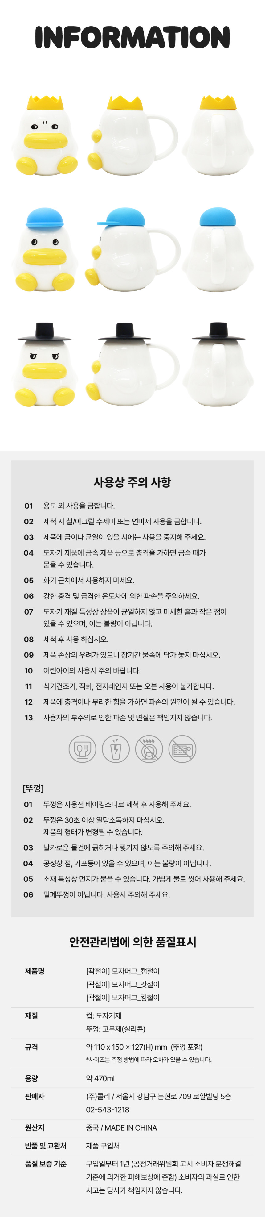 详细情报运营方针客户评论NOTICE* 商品外盒是为保护商品防止冲击而制作的,在包装/运输过程中可能会产生划痕及褶皱、变色等现象,该现象不能作为商品的退换理由。[Qwakcheol] Hat Mug (3type) PART INFORMATION 商品情报提供告示商品名 : [Qwakcheol] 帽子马克杯(3款)原产地 : China制造/进口 : 주식회사 콜리 质量保证标准 : 依照相关法律及消费者纠纷解决规定AS中心热线 : Ktown4u, 02-552-0978