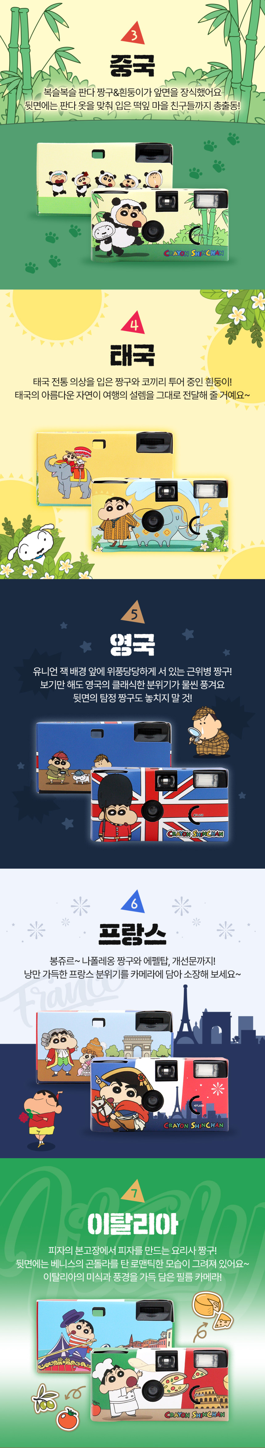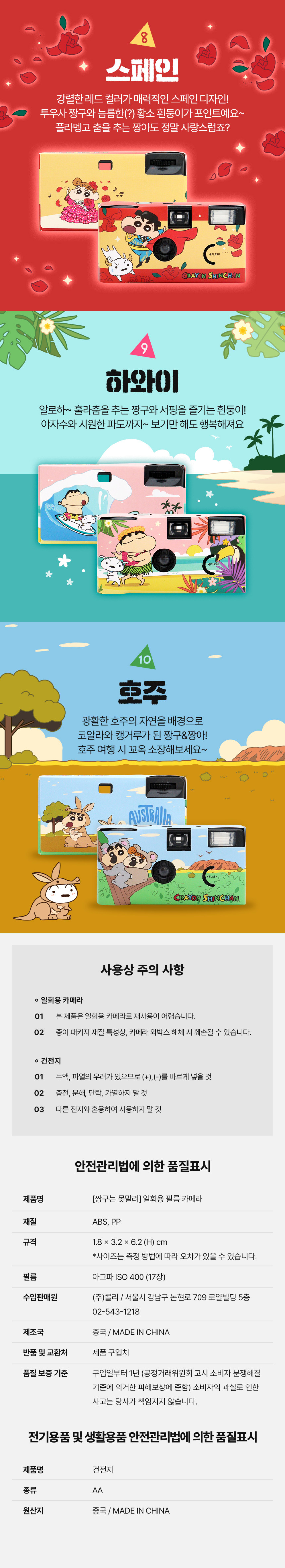 详细情报运营方针客户评论NOTICE* 商品外盒是为保护商品防止冲击而制作的,在包装/运输过程中可能会产生划痕及褶皱、变色等现象,该现象不能作为商品的退换理由。[Crayon Shin-chan] Disposable Camera Country Edition (10type) PART INFORMATION 商品情报提供告示商品名 : [蜡笔小新] 一次性相机 国家限定版(10款)原产地 : China制造/进口 : 주식회사 콜리 质量保证标准 : 依照相关法律及消费者纠纷解决规定AS中心热线 : Ktown4u, 02-552-0978