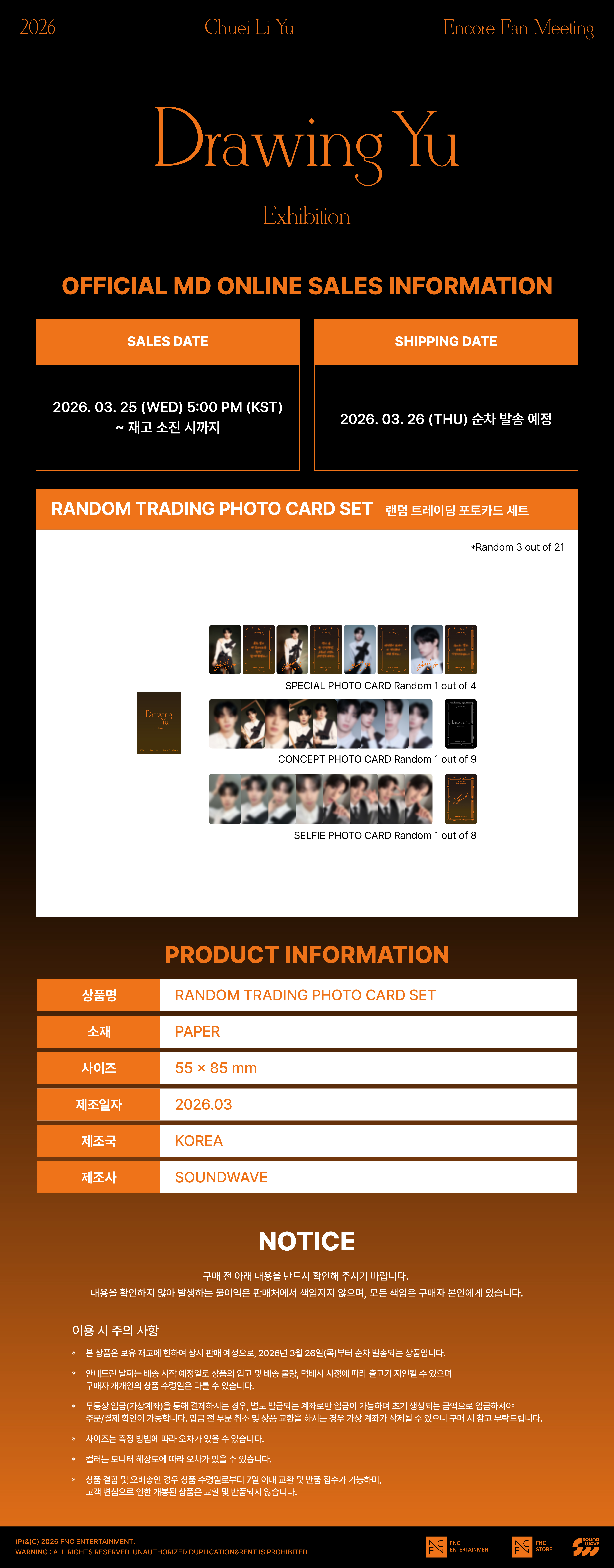 详细情报运营方针客户评论NOTICE* 商品外盒是为保护商品防止冲击而制作的,在包装/运输过程中可能会产生划痕及褶皱、变色等现象,该现象不能作为商品的退换理由。Chuei Li Yu[2026 Encore Fan Meeting [Drawing Yu] MD] RANDOM TRADING PHOTO CARD SETPART INFORMATION 商品情报提供告示商品名 : Chuei Li Yu- [2026 Encore Fan Meeting [Drawing Yu] MD] RANDOM TRADING PHOTO CARD SET原产地 : Korea制造/进口 : 质量保证标准 : 依照相关法律及消费者纠纷解决规定AS中心热线 : Ktown4u, 02-552-0978