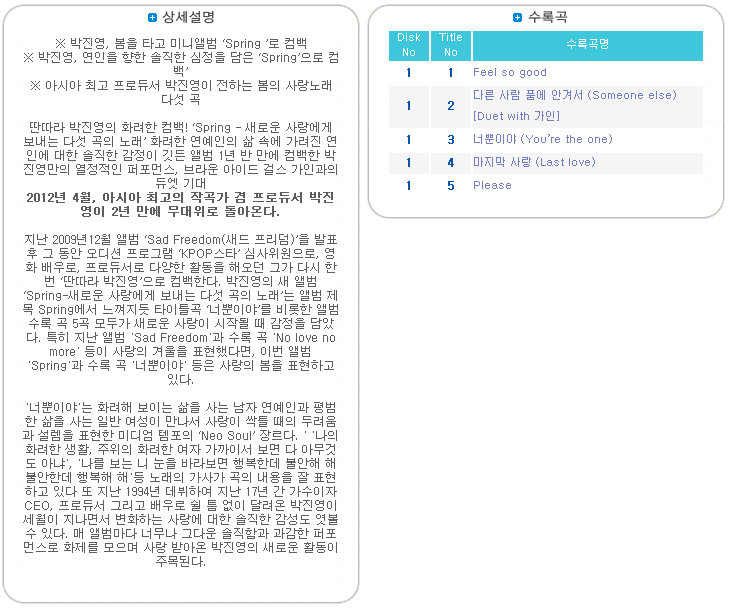 详细情报运营方针客户评论NOTICE* 商品外盒是为保护商品防止冲击而制作的,在包装/运输过程中可能会产生划痕及褶皱、变色等现象,该现象不能作为商品的退换理由。商品情报提供告示商品名 : Park Jin Young - Mini Album [Spring]原产地 : Korea制造/进口 : (주)드림어스컴퍼니 质量保证标准 : 依照相关法律及消费者纠纷解决规定AS中心热线 : Ktown4u, 02-552-0978
