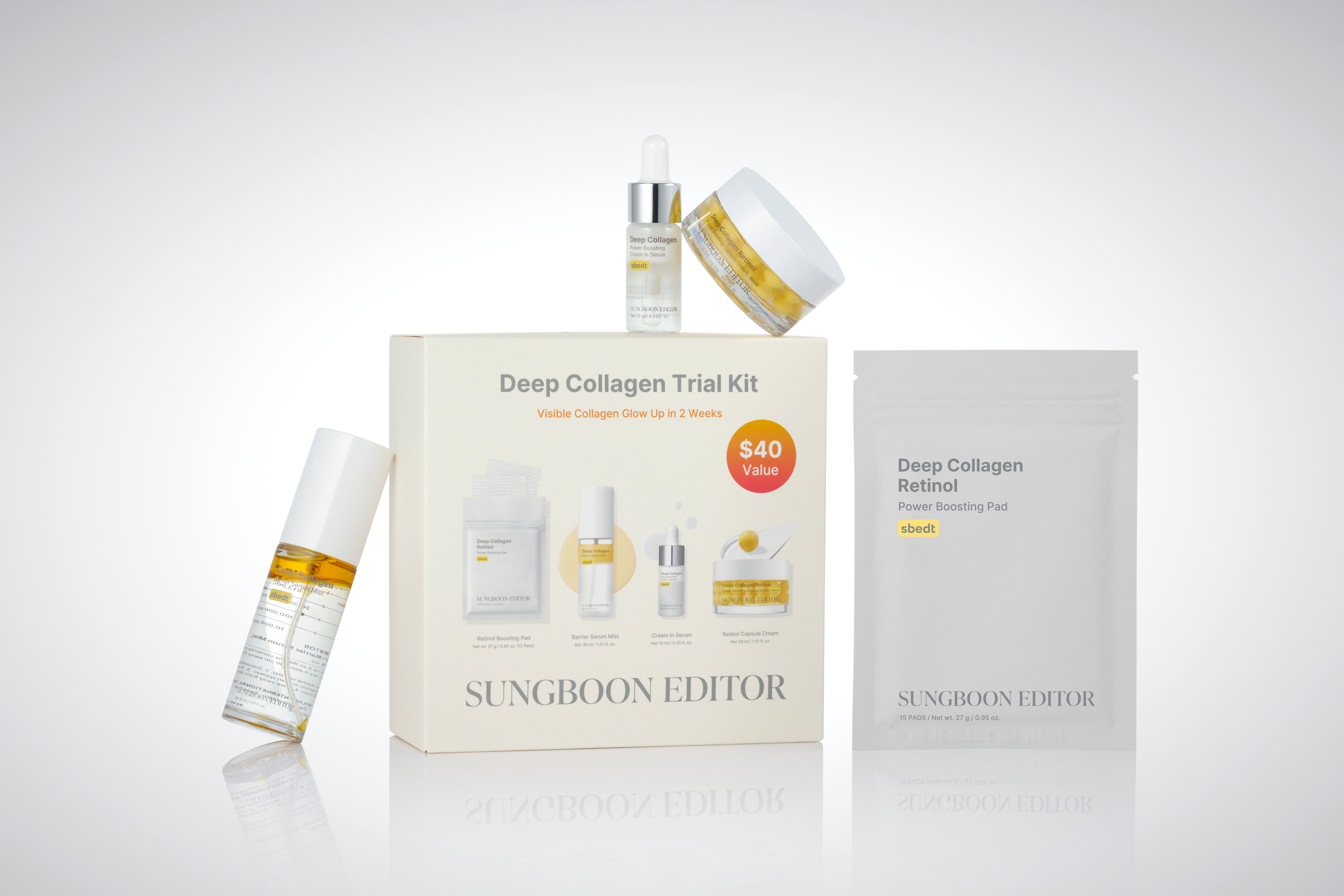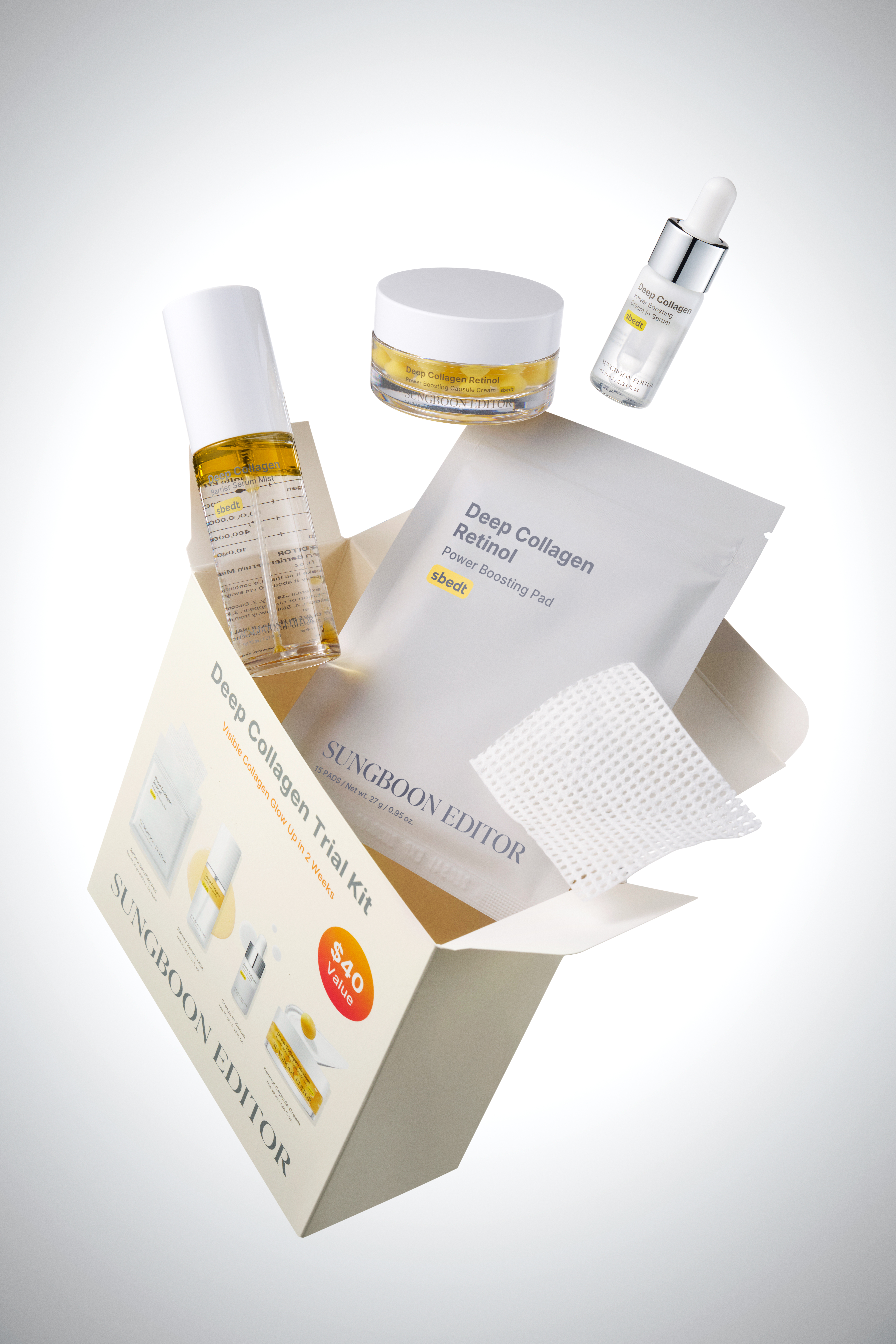 详细情报运营方针客户评论NOTICE* 商品外盒是为保护商品防止冲击而制作的,在包装/运输过程中可能会产生划痕及褶皱、变色等现象,该现象不能作为商品的退换理由。[Sungboon Editor] Deep Collagen Trial Kit 4ea Retinol Boosting Pad (15Pads) + Barrier Serum Mist 30ml + Cream In Serum 10ml + Retinol Capsule Cream 30mlINFORMATION 商品情报提供告示商品名 : [Sungboon Editor] Deep Collagen Trial Kit 4ea原产地 : Korea制造/进口 : COSMAX 质量保证标准 : 依照相关法律及消费者纠纷解决规定AS中心热线 : Ktown4u, 02-552-0978