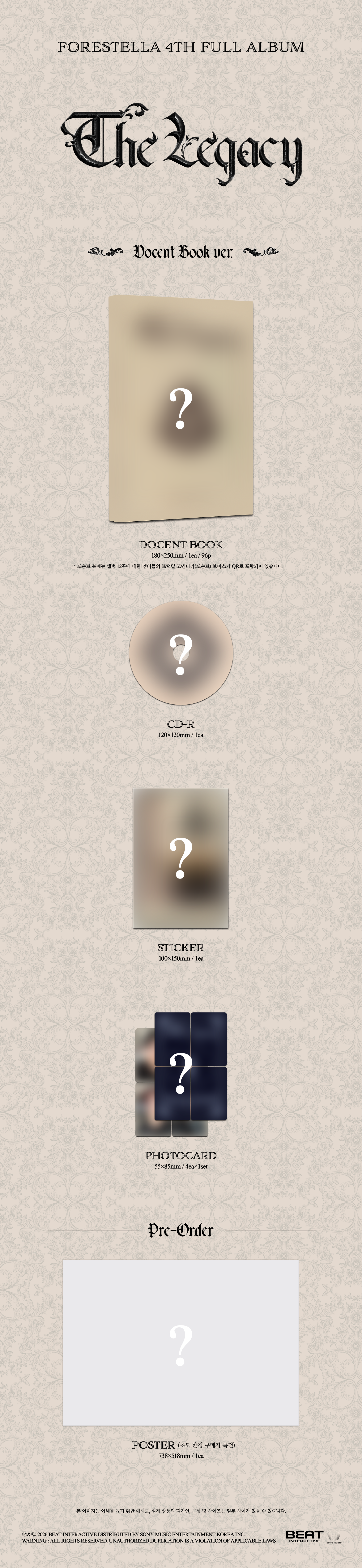 장르의 경계를 넘나드는 시도와 독보적인 하모니로 그들만의 색을 완성해 온 포레스텔라는, 매 순간 새로운 가능성을 증명하며 자신들의 영역을 확장해 왔다.이번 [THE LEGACY] 앨범은 그 시작과 현재를 잇는 시간의 축 위에서, 포레스텔라가 쌓아온 음악적 흔적들을 집약한 하나의 기록이다.
