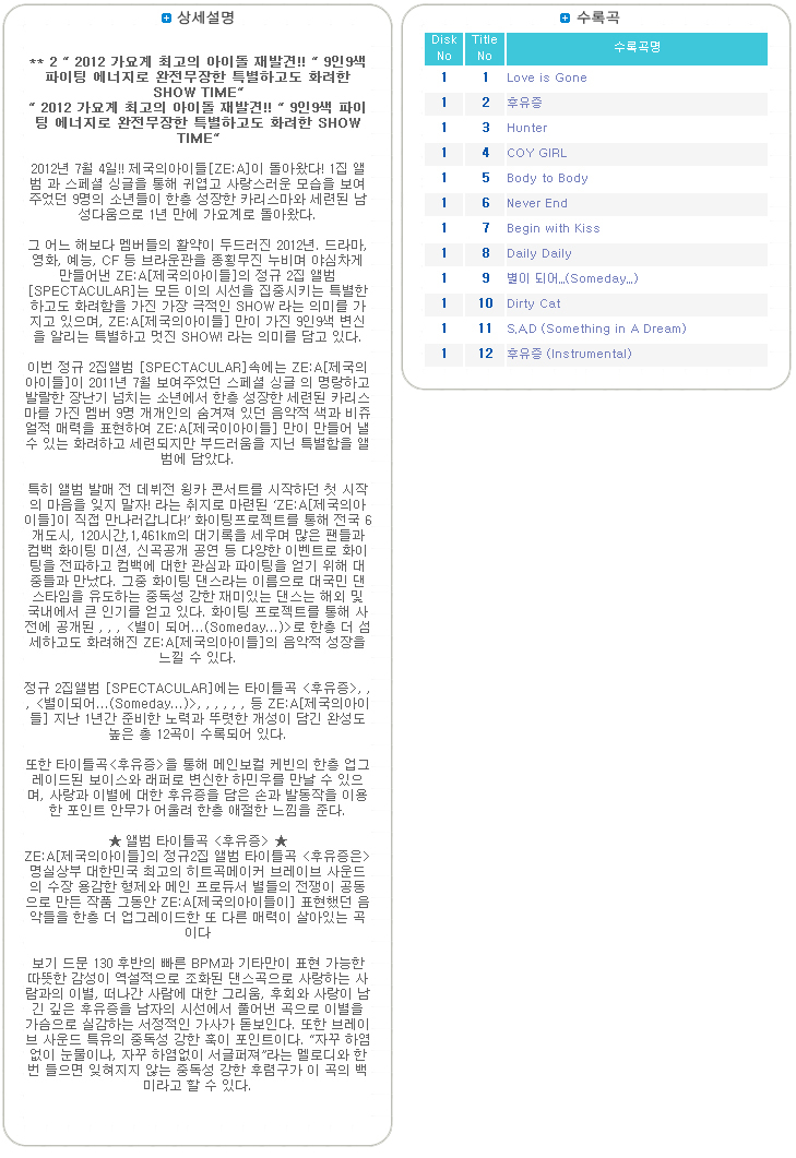 详细情报运营方针客户评论NOTICE* 商品外盒是为保护商品防止冲击而制作的,在包装/运输过程中可能会产生划痕及褶皱、变色等现象,该现象不能作为商品的退换理由。商品情报提供告示商品名 : ZE:A(Children of Empire) - Vol.2 [Spectacular] 原产地 : Korea制造/进口 : (주)지니뮤직 质量保证标准 : 依照相关法律及消费者纠纷解决规定AS中心热线 : Ktown4u, 02-552-0978