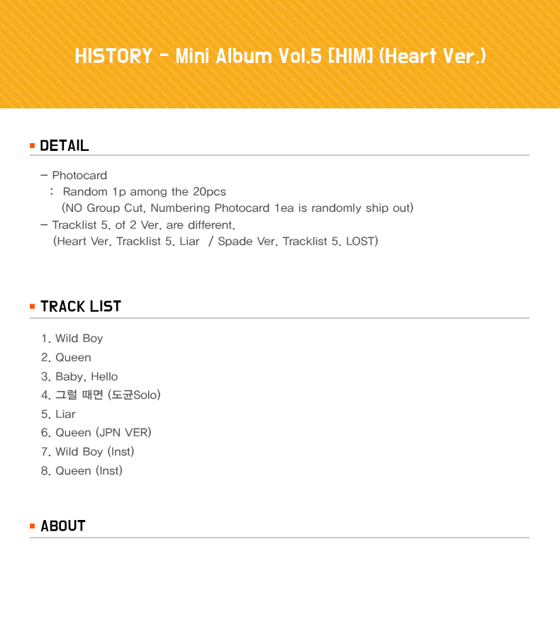 HISTORYHISTORY - Mini Album Vol.5 [HIM] (Heart Ver.)RMB59.13发行日2016-04-12预计入库时间2023-08-11积分11Goods codeGD00024537售销记录114