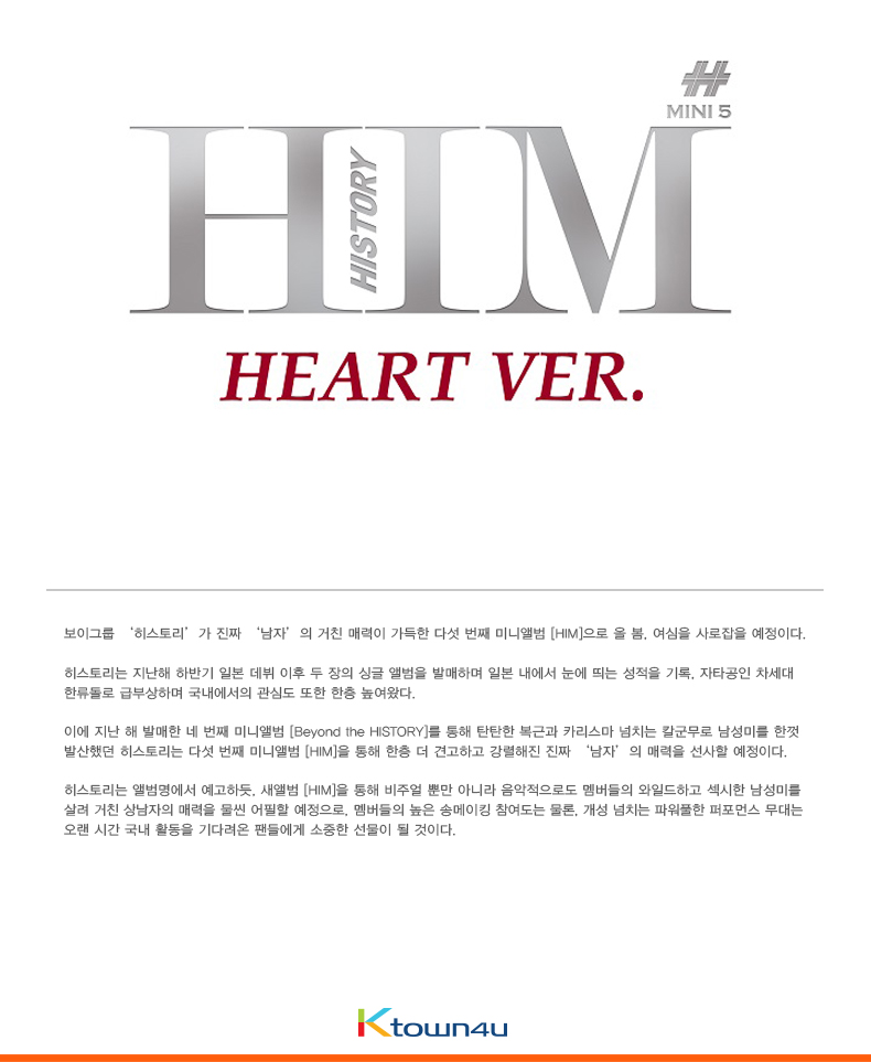 详细情报运营方针客户评论NOTICE* 商品外盒是为保护商品防止冲击而制作的,在包装/运输过程中可能会产生划痕及褶皱、变色等现象,该现象不能作为商品的退换理由。 商品情报提供告示商品名 : HISTORY - Mini Album Vol.5 [HIM] (Heart Ver.)原产地 : Korea制造/进口 : 质量保证标准 : 依照相关法律及消费者纠纷解决规定AS中心热线 : Ktown4u, 02-552-0978