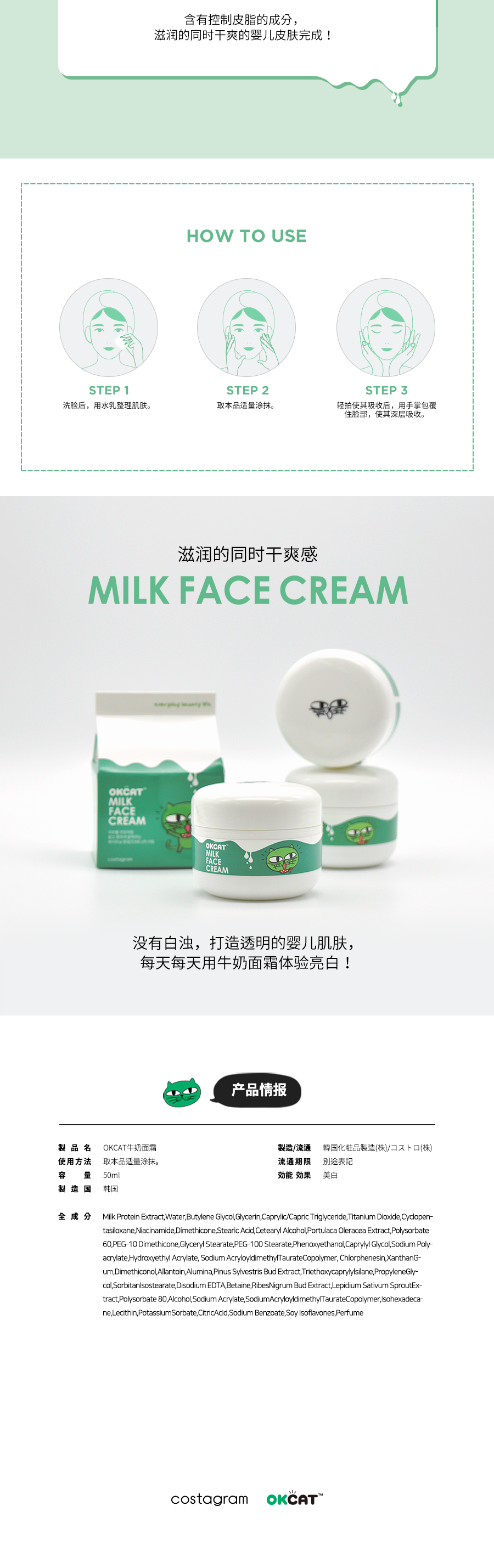 详细情报运营方针客户评论NOTICE* 商品外盒是为保护商品防止冲击而制作的,在包装/运输过程中可能会产生划痕及褶皱、变色等现象,该现象不能作为商品的退换理由。[costagram] OKCAT MILK FACE CREAM (2PM :Taec Yeon) 商品情报提供告示商品名 : OKCAT 牛奶美白面霜 (2PM : 玉泽演) costagram原产地 : Korea制造/进口 : 质量保证标准 : 依照相关法律及消费者纠纷解决规定AS中心热线 : Ktown4u, 02-552-0978