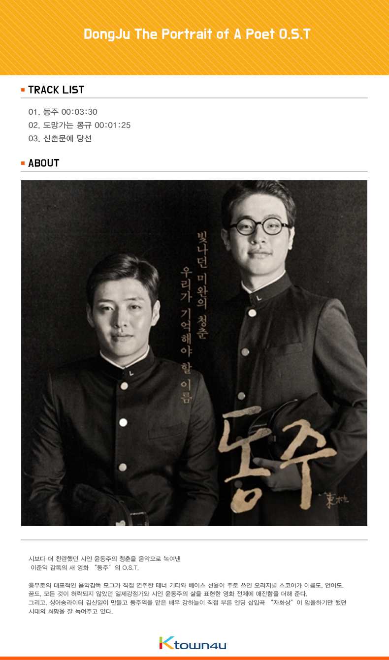 详细情报运营方针客户评论NOTICE* 商品外盒是为保护商品防止冲击而制作的,在包装/运输过程中可能会产生划痕及褶皱、变色等现象,该现象不能作为商品的退换理由。商品情报提供告示商品名 : DongJu The Portrait of A Poet O.S.T原产地 : Korea制造/进口 : (주)윈드밀이엔티 质量保证标准 : 依照相关法律及消费者纠纷解决规定AS中心热线 : Ktown4u, 02-552-0978
