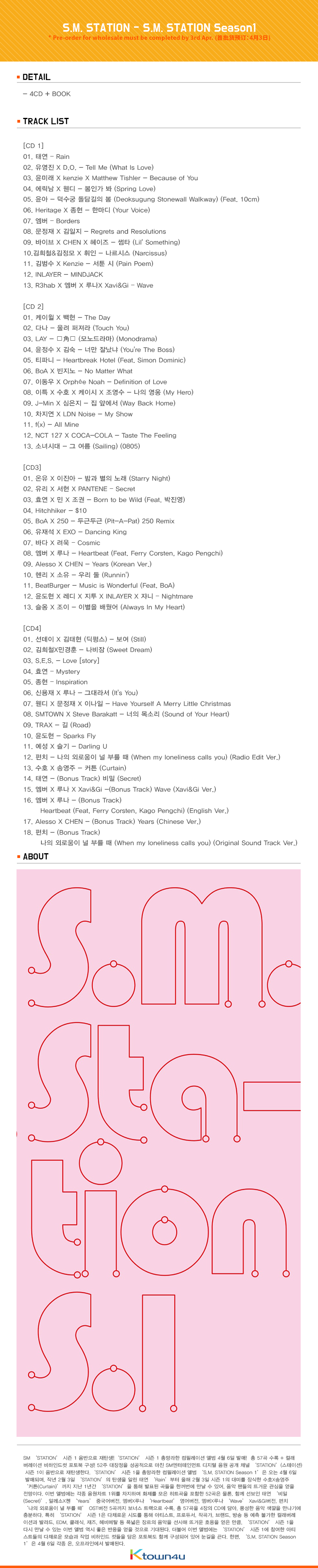 详细情报运营方针客户评论NOTICE* 商品外盒是为保护商品防止冲击而制作的,在包装/运输过程中可能会产生划痕及褶皱、变色等现象,该现象不能作为商品的退换理由。商品情报提供告示商品名 : S.M. STATION - S.M. STATION Season1原产地 : Korea制造/进口 : 质量保证标准 : 依照相关法律及消费者纠纷解决规定AS中心热线 : Ktown4u, 02-552-0978