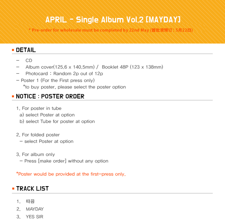 详细情报运营方针客户评论NOTICE* 商品外盒是为保护商品防止冲击而制作的,在包装/运输过程中可能会产生划痕及褶皱、变色等现象,该现象不能作为商品的退换理由。商品情报提供告示商品名 : APRIL - Single Album Vol.2 [MAYDAY]原产地 : Korea制造/进口 : 质量保证标准 : 依照相关法律及消费者纠纷解决规定AS中心热线 : Ktown4u, 02-552-0978
