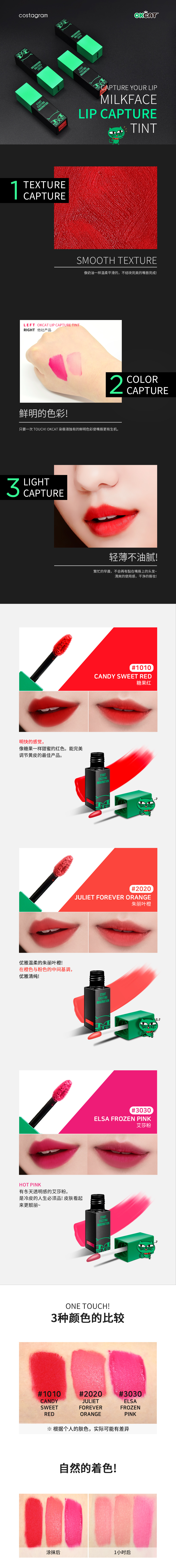 详细情报运营方针客户评论NOTICE* 商品外盒是为保护商品防止冲击而制作的,在包装/运输过程中可能会产生划痕及褶皱、变色等现象,该现象不能作为商品的退换理由。[costagram] OKCAT MILK FACE LIP CAPTURE TINT #2020 Juliet forever orange 商品情报提供告示商品名 : OKCAT 染唇液 (#2020 朱丽叶橙) costagram原产地 : Korea制造/进口 : 质量保证标准 : 依照相关法律及消费者纠纷解决规定AS中心热线 : Ktown4u, 02-552-0978