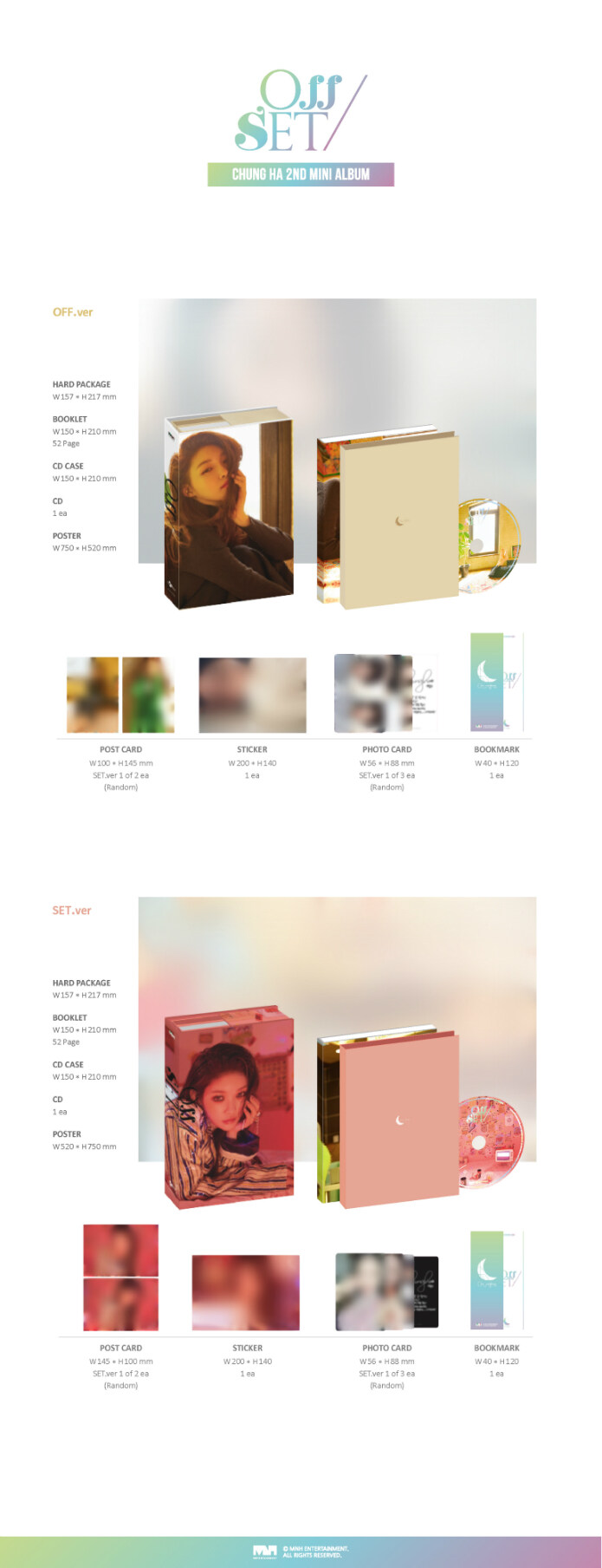 - 구성 : OFF / SET Ver. (2종), 하드커버 + 부클릿(52p) + 엽서 (각 버전별 랜덤 2종 중 1종) + 포토카드 (각 버전별 랜덤 3종 중 1종) + 스티커 (각 버전별 1종) + 책갈피 1종