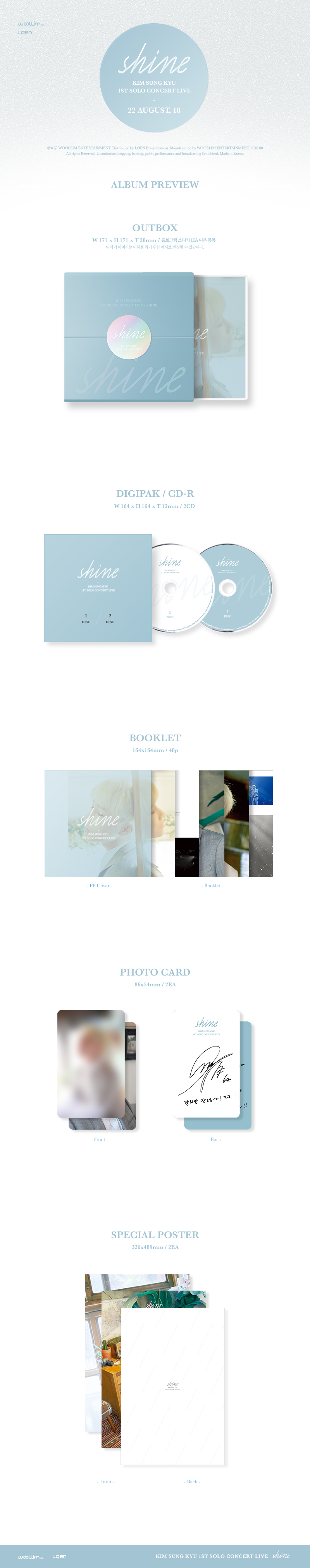 이번에 발매되는 라이브 앨범 [KIM SUNG KYU 1st Solo Concert Live Shine]은 지난 5월 5~7일 경희대학교 평화의 전당에서 열린 콘서트 현장의 생생한 감동을 담아낸 앨범으로 김성규의 목소리를 기다린 팬들에게는 그 무엇보다도 반가운 선물이 될 것이다.