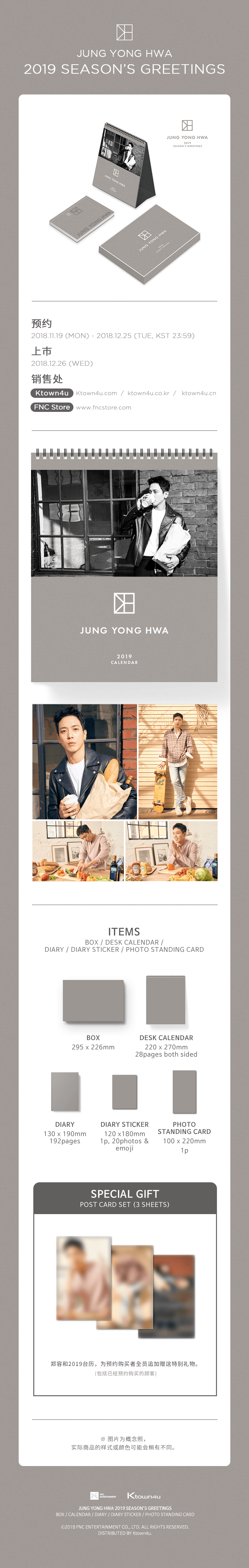 详细情报运营方针客户评论NOTICE* 商品外盒是为保护商品防止冲击而制作的,在包装/运输过程中可能会产生划痕及褶皱、变色等现象,该现象不能作为商品的退换理由。CNBLUE : JUNG YONG HWA 2019 SEASON'S GREETINGS PART * The outer case is just for protecting goods. (scratches and discoloration on the case can not be the reason for exchanging or returning) - Desk Calendar : 28p both sided (220*270mm) - Diray : 192p (130*190mm) - Diray Sticker : 1p, 20photos & emoticon (120*180mm) - Photo Standing Card : 1p (100*220mm) INFORMATION 商品情报提供告示商品名 : 郑容和 - 2019 SEASON GREETING 台历套装原产地 : Korea制造/进口 : FNC Entertainment FNC Entertainment质量保证标准 : 依照相关法律及消费者纠纷解决规定AS中心热线 : Ktown4u, 02-552-0978