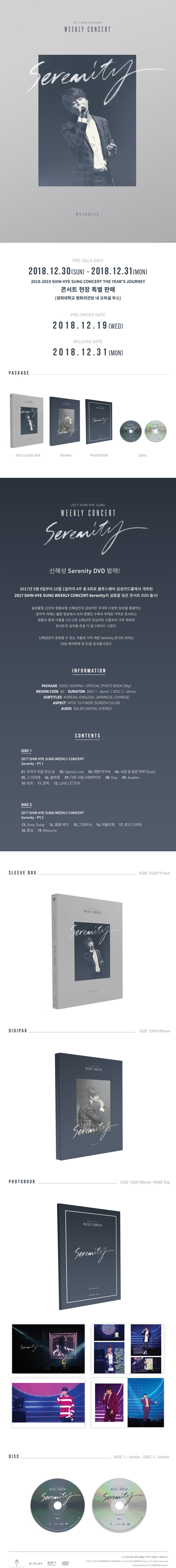 2017년 9월 9일부터 10월 1일까지 4주 총 8회로 블루스퀘어 삼성카드홀에서 개최된 2017 SHIN HYE SUNG WEEKLY CONCERT-Serenity의 실황을 담은 콘서트 DVD 출시!