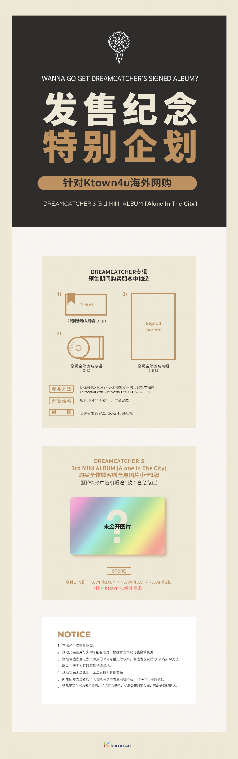 *Ktown4u's special Hologram photocard will be given in case of purchasingDREAMCATCHER - Mini Album Vo.3 [Alone In The City] in Ktown4 (~until sold out)