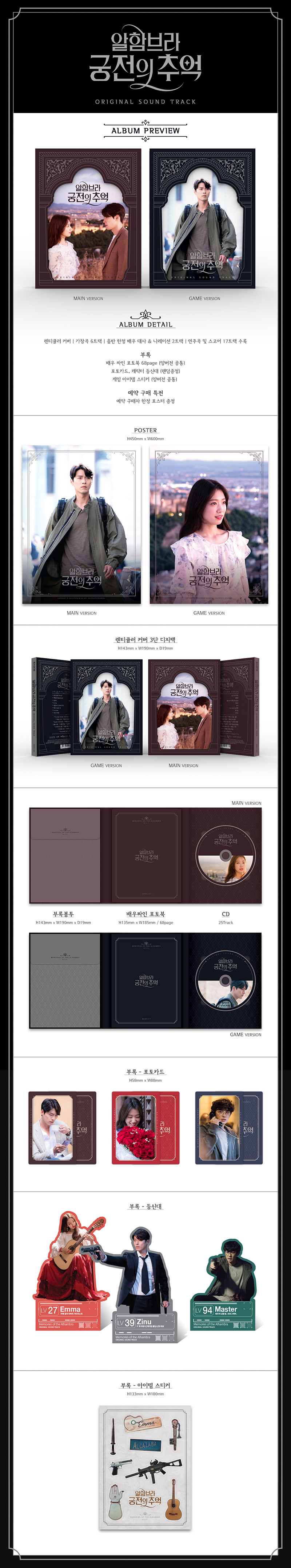 [알함브라 궁전의 추억 OST] 독특한 소재, 마법과 같은 환상적인 스토리와 로맨스로 화제를 모은 tvN 토일 드라마 ‘알함브라 궁전의 추억’의 OST 음반이 정식 발매된다. 드라마와 함께 ' 알함브라 궁전의 추억 ' OST는 화려한 가창자 라인업과 함께 드라마 주요 장면에 삽입되며 시청자들에게 깊은 감동과 여운을 선사하였다. 이번에 발매되는 ' 알함브라 궁전의 추억 OST' 오프라인 음반은 '메인' 버전과 '게임' 버전의 두 종류이며, 앞 면의 커버를 렌티큘러 소재로 제작하여 움직이는 듯 한 이미지로 생동감을 불어넣는 한 편, 게임을 소재로 한 드라마의 정체성을 잘 표현해주고 있다. 온라인으로 공개되었던 OST 가창곡 전곡 및 미공개 되었던 연주 버전 OST가 수록 되었을 뿐 아니라 '알함브라 궁전의 추억' 만의 감성과 분위기를 느낄 수 있도록 엄선된 스코어가 수록 되었으며 주연 배우들의 대사와 나레이션 트랙 2트랙을 담아 총 25 트랙이 수록된다. 뿐만 아니라, 음반에는 주요 배우 포토카드와 등신대, 게임 속 아이템을 활용해 제작된 스티커, 예약 구매자 한정으로 증정되는 포스터까지 특별한 부록들도 함께 만나볼 수 있어 종영을 아쉬워하는 드라마 애청자들에게 의미를 더할 것으로 보인다. tvN 토일드라마 ‘알함브라 궁전의 추억’은 투자회사 대표인 유진우(현빈 분)가 비즈니스로 스페인 그라나다에 갔다가 전직 기타리스트였던 정희주(박신혜 분)가 운영하는 싸구려 호스텔에 묵으며 두 사람이 기묘한 사건에 휘말리며 펼쳐지는 이야기로 20일을 끝으로 막을 내린다.