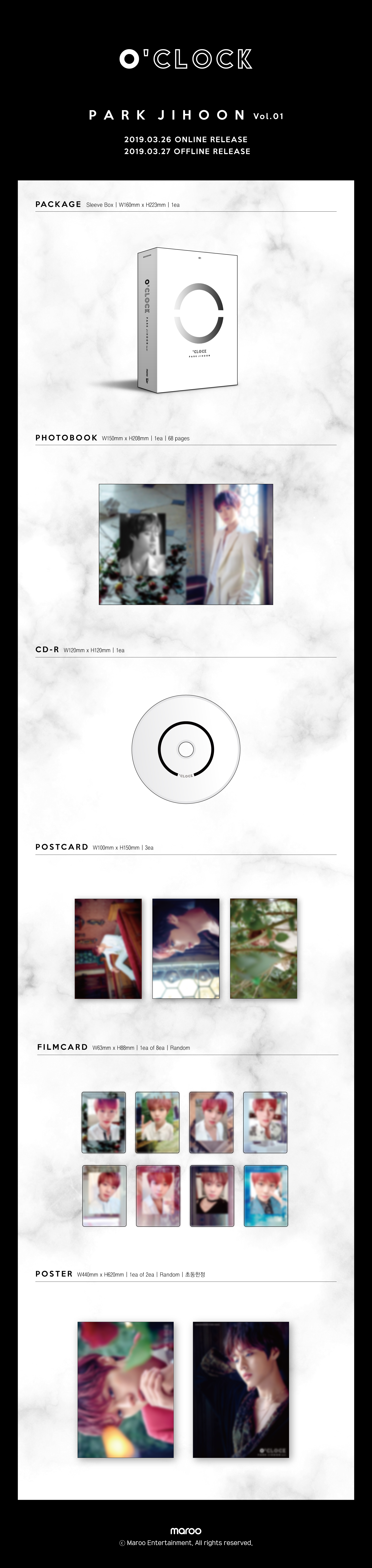 일상처럼 흘러가는 시간 속에서 빠져 나와 정해진 운명에 맞춰 새로운 세상의 문을 열고 우리를 초대한 박지훈의 첫 솔로 음반 [O'CLOCK]. '사랑'을 메인 테마로 순수함과 환희, 열정 등의 감정을 오롯이 채워놓은 앨범이다.