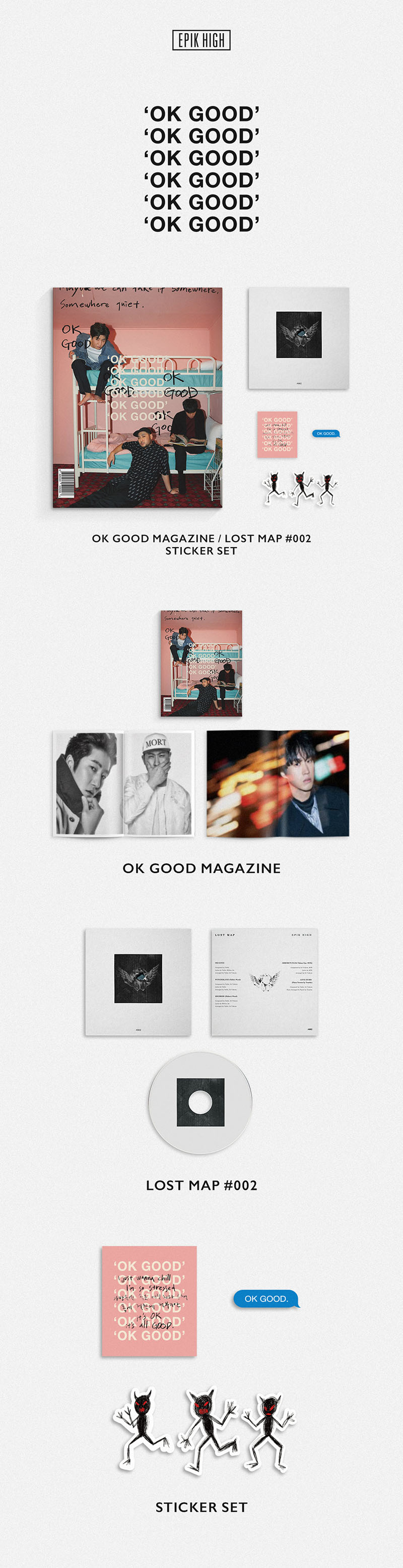 EPIK HIGH [LOST MAP #002]에픽하이 소극장 콘서트 ‘현재상영중 2018’ 현장에서만 구입할 수 있었던 ‘OK GOOD MAGAZINE PACKAGE’가 부득이한 사정으로 공연장을 찾아주지 못한 국내외 팬들을 위해 한정수량 판매된다.‘OK GOOD MAGAZINE PACKAGE’는 컬렉터즈 에디션 매거진 ‘OK GOOD’과 온라인 음원 공개 없이 CD로만 제작된 비정규앨범 ‘LOST MAP 2’로 구성되어 있다. 에픽하이의 이번 앨범 ‘LOST MAP 2’는 보고 즐기는 음악이 당연해진 요즘, ‘듣는 가치’를 새겨주며 기존의 앨범 발매 관습을 모두 깨버리는 파격적인 행보를 보인다. 관상용으로의 가치만 남은 CD라는 사물을 원래의 쓰임으로 돌려놓고, 온라인 스트리밍이 아닌 CDP와 이어폰을 통해 에픽하이의 ‘음악’을 온전하게 전하길 원하는 아티스트의 진심이 담겨있다.특히, 총 5트랙이 수록된 ‘LOST MAP 2’는 공들여 작업한 4개의 신곡과 함께 9집 앨범 [WE`VE DONE SOMETHING WONDERFUL]에 수록되며 국내 음원차트 퍼펙트 올킬을 달성했던 ‘연애소설'을 가수 윤하가 피아노로 재해석하고 연주하여 새로운 감성을 전달한다.