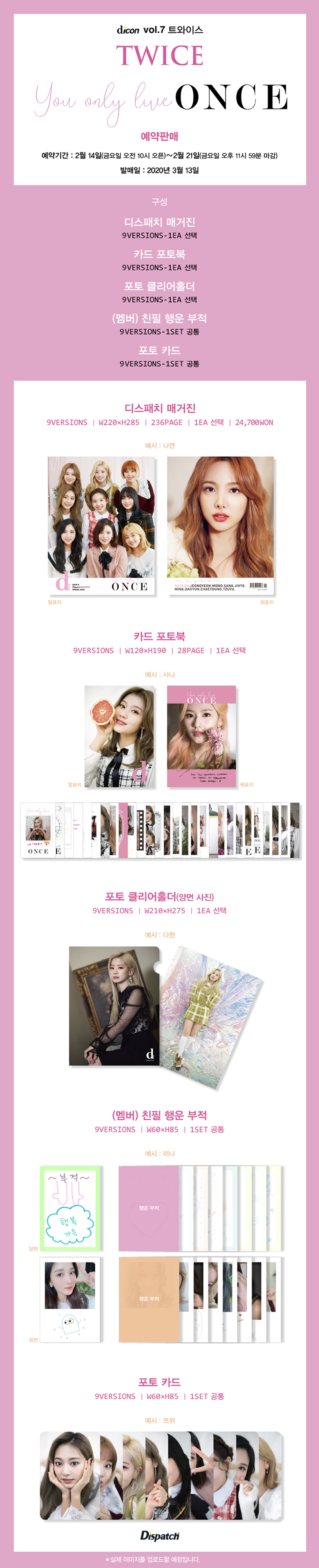 详细情报运营方针客户评论NOTICE* 商品外盒是为保护商品防止冲击而制作的,在包装/运输过程中可能会产生划痕及褶皱、变色等现象,该现象不能作为商品的退换理由。[Magazine] D-icon Vol.7 TWICE, You only live ONCE- 08 CHAEYOUNG [2020] PART * The outer case is just for protecting goods. (scratches and discoloration on the case can not be the reason for exchanging or returning) - SIZE : 220*285*30mm - MAGAZINE : 236p (Member version purchased) - MINI PHOTOBOOK : 28p (Member version purchased) - PHOTO CLEAR HOLDER : 1p (Member version purchased) - MEMBER LUCKY AMULET : 9Ver 1set - PHOTOCARD : 9Ver 1set INFORMATION 商品情报提供告示商品名 : [Magazine] D-icon : Vol.7 TWICE - TWICE, You only live ONCE- 08 CHAEYOUNG [2020]原产地 : Korea制造/进口 : 质量保证标准 : 依照相关法律及消费者纠纷解决规定AS中心热线 : Ktown4u, 02-552-0978