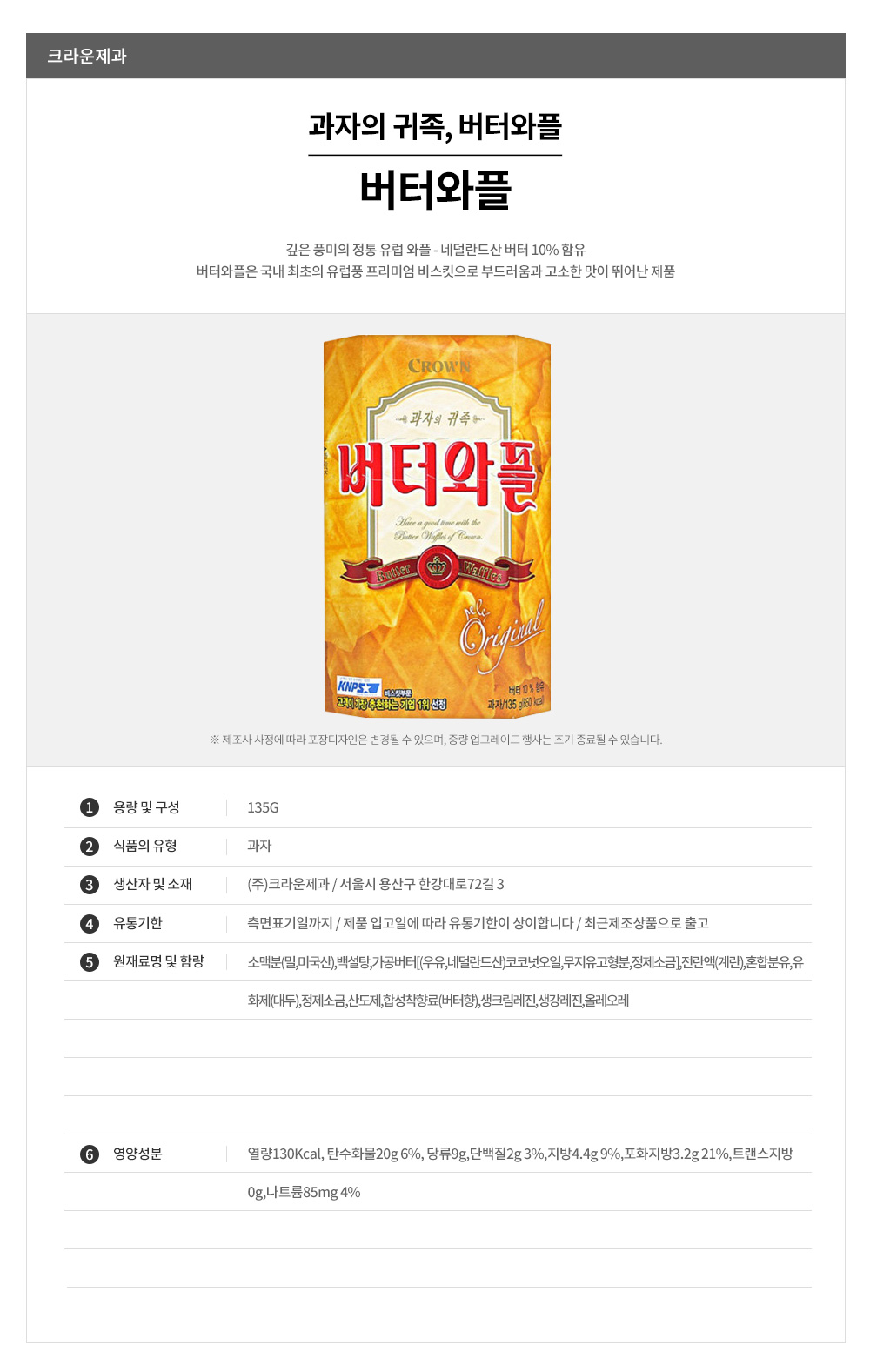 详细情报运营方针客户评论NOTICE* 商品外盒是为保护商品防止冲击而制作的,在包装/运输过程中可能会产生划痕及褶皱、变色等现象,该现象不能作为商品的退换理由。[CROWN] Butter Waffles 135g INFORMATION 商品情报提供告示商品名 : [CROWN] Butter Waffles 135g*1EA原产地 : Korea制造/进口 : 质量保证标准 : 依照相关法律及消费者纠纷解决规定AS中心热线 : Ktown4u, 02-552-0978