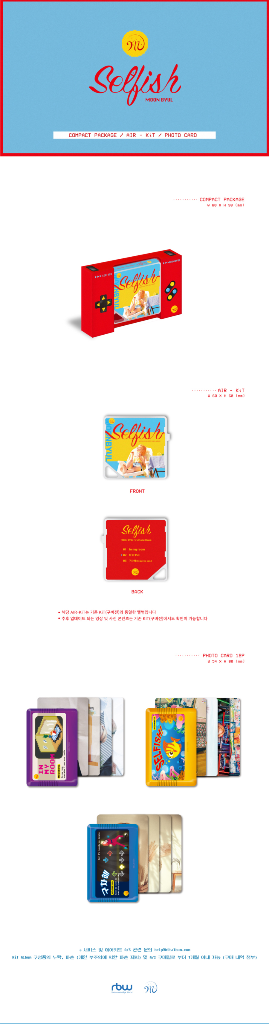 详细情报运营方针客户评论NOTICE* 商品外盒是为保护商品防止冲击而制作的,在包装/运输过程中可能会产生划痕及褶皱、变色等现象,该现象不能作为商品的退换理由。Moon Byul Solo Album Vol.1 [SELFISH] (Kit Album) PART * The outer case is just for protecting goods. (scratches and discoloration on the case can not be the reason for exchanging or returning) - COMPACT PACKAGE : 60x90mm - AIR-KiT : 60x60mm - PHOTO CARD : 54x86mm / 12p TRACK LIST INFORMATION 商品情报提供告示商品名 : Moon Byul - Solo Album Vol.1 [SELFISH] (Kit Album 手机智能版) 原产地 : Korea制造/进口 : RBW Kakao Entertainment质量保证标准 : 依照相关法律及消费者纠纷解决规定AS中心热线 : Ktown4u, 02-552-0978