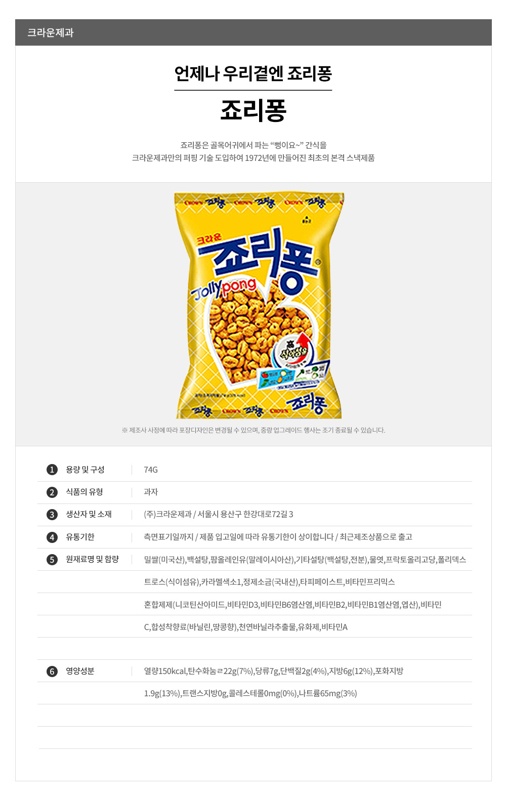 详细情报运营方针客户评论NOTICE* 商品外盒是为保护商品防止冲击而制作的,在包装/运输过程中可能会产生划痕及褶皱、变色等现象,该现象不能作为商品的退换理由。[CROWN] Jolly pong - Cereal Snack 74g 商品情报提供告示商品名 : [CROWN] Jolly pong - Cereal Snack 74g*1EA原产地 : Korea制造/进口 : 质量保证标准 : 依照相关法律及消费者纠纷解决规定AS中心热线 : Ktown4u, 02-552-0978
