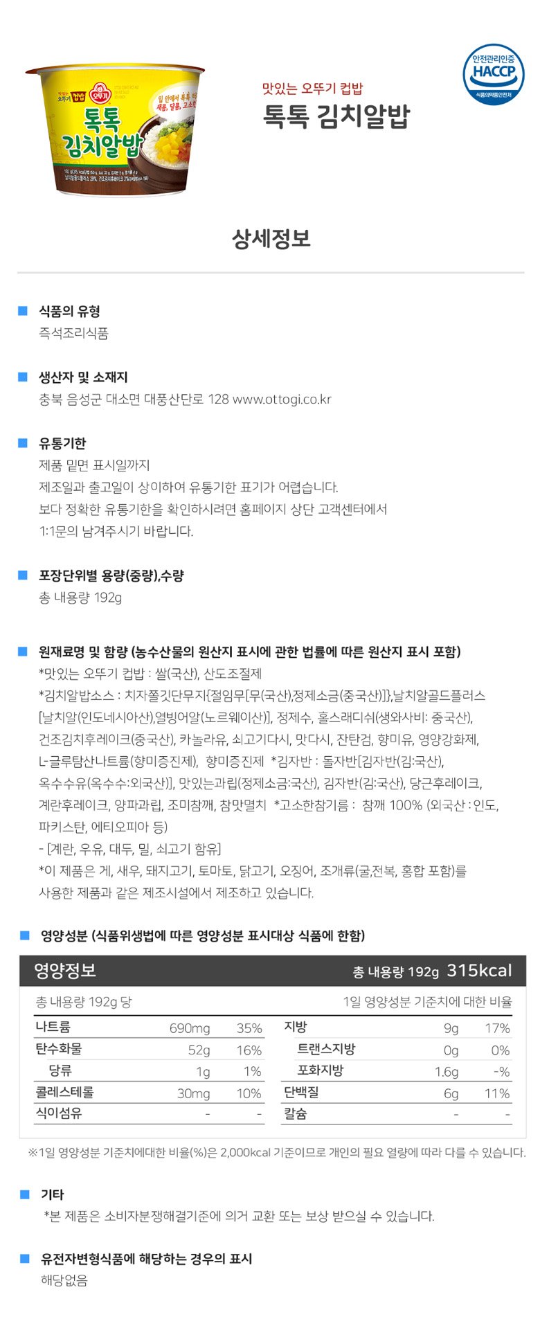 详细情报运营方针客户评论NOTICE* 商品外盒是为保护商品防止冲击而制作的,在包装/运输过程中可能会产生划痕及褶皱、变色等现象,该现象不能作为商品的退换理由。[OTTOGI] Cup Rice - Kimchi Fish Roe Rice 192g*1EA 商品情报提供告示商品名 : [Ottogi] Cup Rice - Kimchi Fish Roe Rice 192g*1EA原产地 : Korea制造/进口 : 质量保证标准 : 依照相关法律及消费者纠纷解决规定AS中心热线 : Ktown4u, 02-552-0978