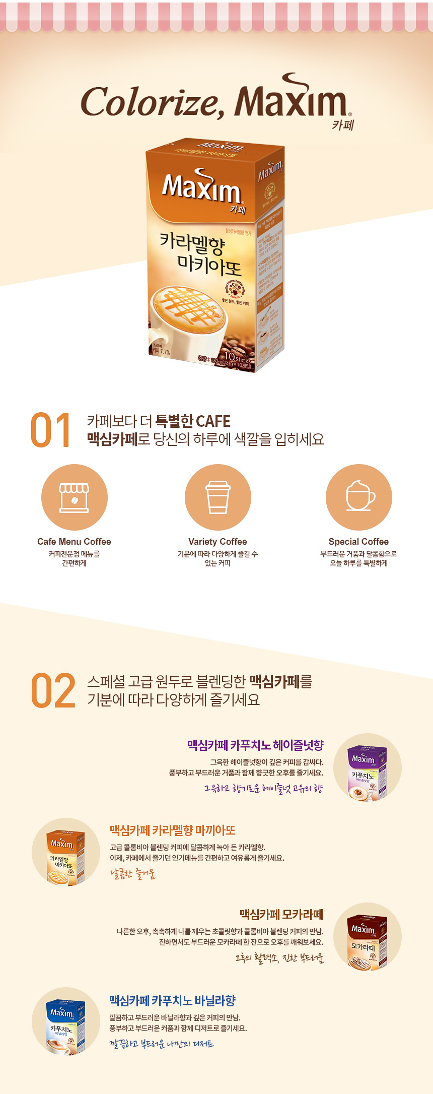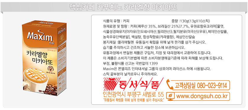详细情报运营方针客户评论NOTICE* 商品外盒是为保护商品防止冲击而制作的,在包装/运输过程中可能会产生划痕及褶皱、变色等现象,该现象不能作为商品的退换理由。[DONGSEO] Maxim Cafe Caramel macchiato 13g 商品情报提供告示商品名 : [MAXIM] Maxim Cafe Caramel macchiato Coffee 13g*10EA原产地 : Korea制造/进口 : 质量保证标准 : 依照相关法律及消费者纠纷解决规定AS中心热线 : Ktown4u, 02-552-0978